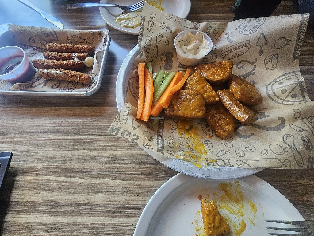 Read moreThe mozzarella sticks are the best I’ve had from a restaurant, and the marinara sauce is excellent. The seitan wings were cooked and seasoned to perfection. Only small qualm is that the celery and carrot sticks that came with them were not the freshest. The pizza crust was delicious and tasted very similar to pizza hut’s crust (a favorite I’ve missed since my pre-vegan days). It was almost focaccia-like?
