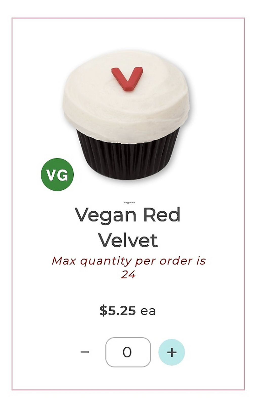 Bakery offering a vegan red velvet cupcake. Open Mon-Thu 10:00am-8:00pm, Fri-Sun 10:00am-9:00pm.