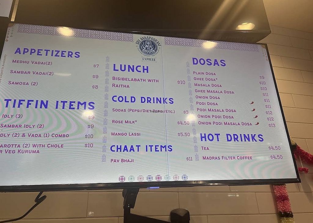 Vegetarian Indian restaurant offering vegan-friendly dishes like Medhu Vada, Sambar Vada, and Samosas. Main dishes feature Idly, Sambar, Parotta, Chole/Kuruma, Aloo Poori, Poori Chole/Kuruma, Dosas, and Pav Bhaji. Open Mon-Fri 11:00am-8:00pm, Sat 11:00am-6:00pm. Closed Sun.