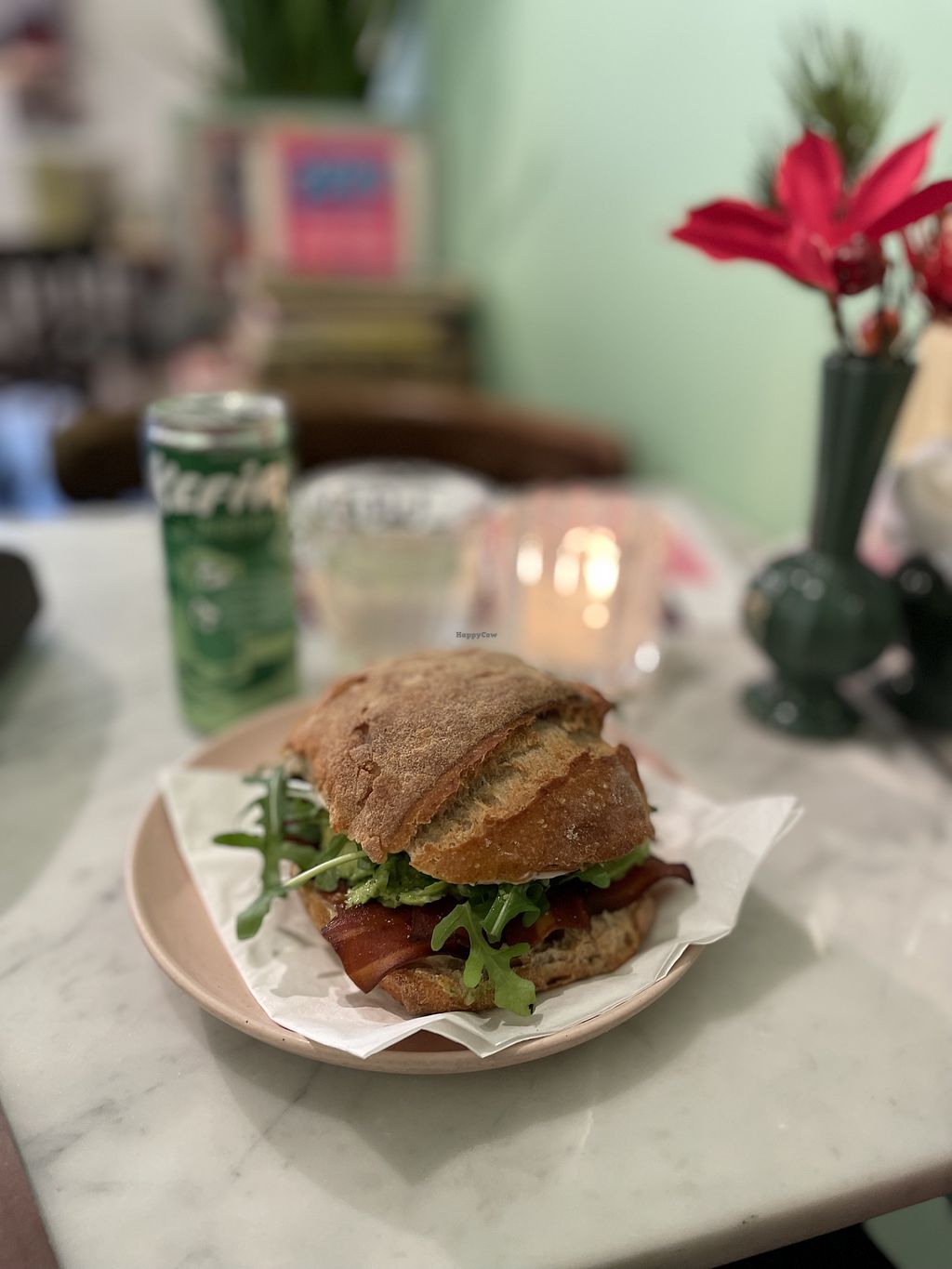 Amazing sourdough sandwich with vegan bacon and avocado. Good ambiance, service a bit slow and uninterested (often young girls).