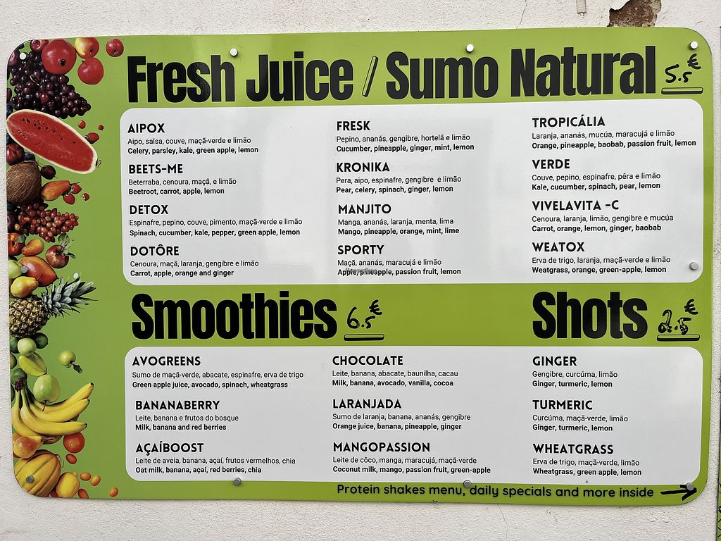 Lots of choices, juices or smoothies. Choose from the menu, choose your own ingredients or take the juice of the day. Everything is made from scratch when you order. Cut and press. Very refreshing!