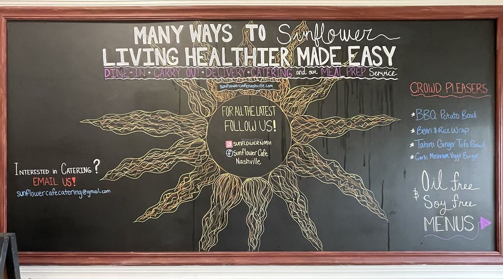 Everything we've had here has been delicious and filling. Most of the time we stop here when in Nashville. Sunflower Cafe keeps us from trying other vegan restaurants because we like it so much. They have a variety of options including burgers, bowls, plates, sides, and some parfait-type desserts. Would highly recommend!