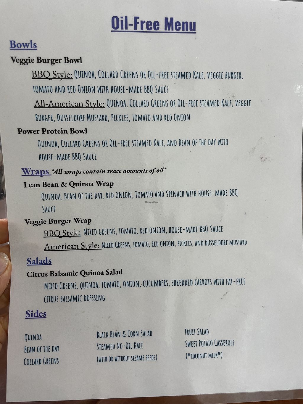 Been here multiple times when visiting Nashville. I dream about their no-bake oat, chocolate peanut butter bar! Ordered my main dishes from the oil-free menu: kale/collard greens, quinoa & lentil power bowl (bbq sauce on the side—too salty for me) and a mixed salad w/citrus dressing. Then splurged on the dessert and bought an extra one to take to my hotel for another day! Staff was so accommodating.
