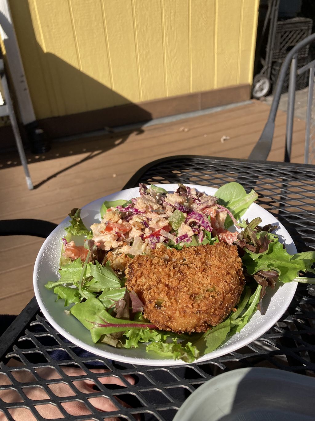 This place has it all: delicious hot counter with many many options, baked goods, beers, craft sodas, ice teas, snacks. And even two cats that roam the premises. The hot chicken potato bowl was absolute fire and made two portions for me. Wonderful crab cakes as well served with yummy slaw.