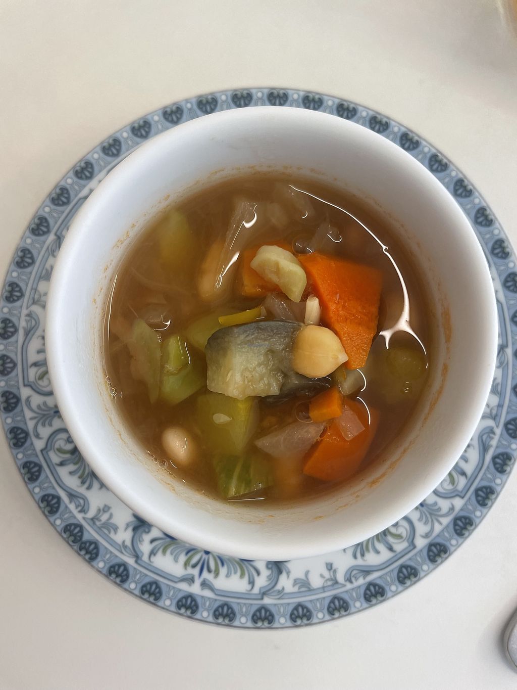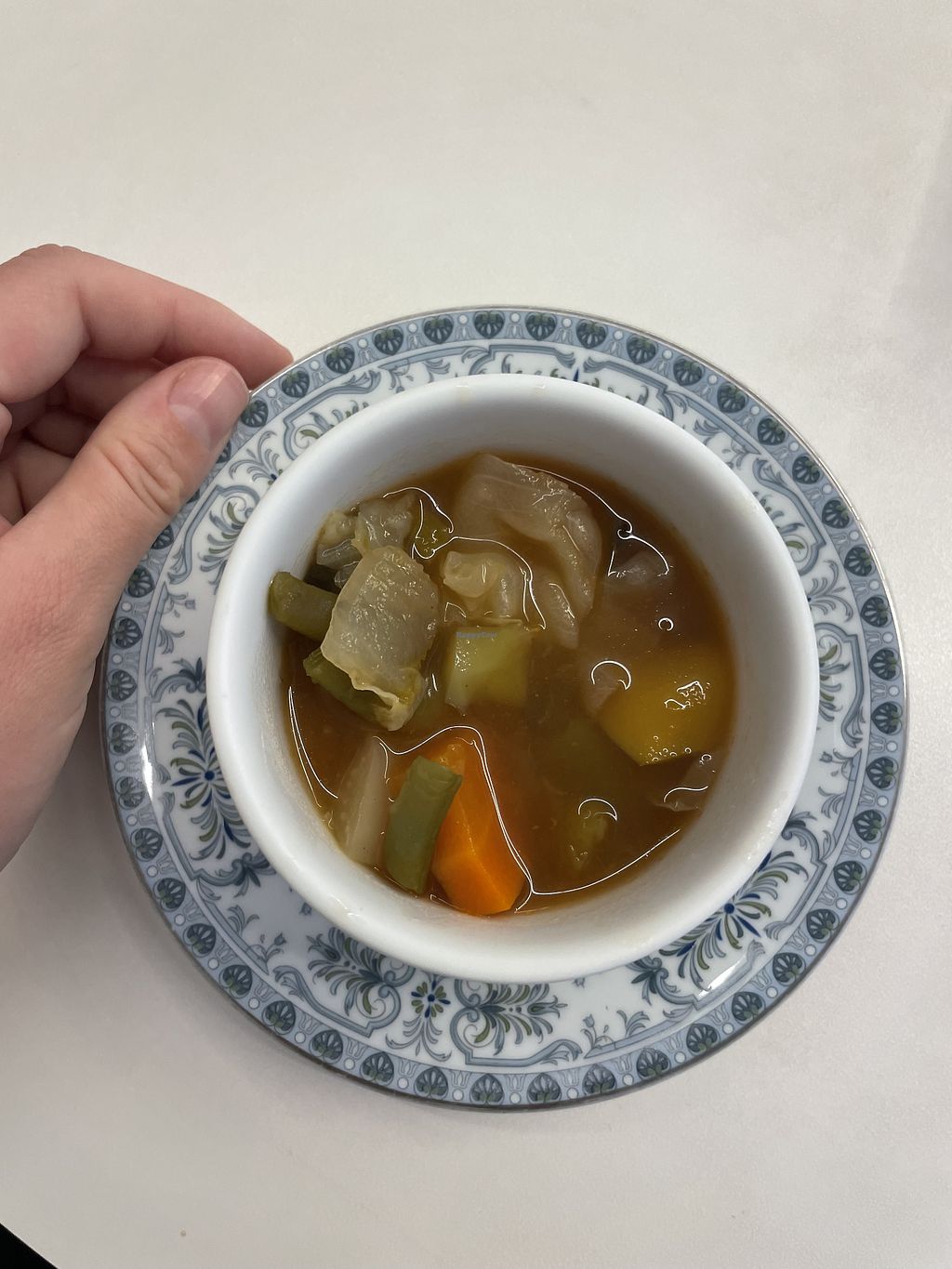 I usually order the vegan chicken salad. Two portion sizes bowl and plate - both are good but for 13k you get a huge bowl with lots of vegan chicken. Love the dressing and salad seems light (just need to add salt to chicken). Complimentary tea, coffee or water plus small minestrone ahead. Clean style and also sells some cookies