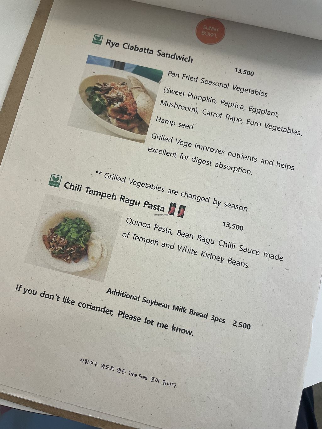 Came to Sunny Bowl for dinner before heading back to Gwangju. It took me a long time to decide what to order since I wanted to try everything. I decided to order the Bean Chicken Salad & Sunny Salad. There are two sizes you can choose from. I ordered a small size for both salads and really enjoyed them both! They were sooo light, refreshing, & tasty!! Both salads had a light simple dressing that didn’t overpower the vegetables. I genuinely enjoyed my meal here. I can’t wait to come back when I’m back in Seoul. I want to try everything! Also, the man that helped me was very kind.