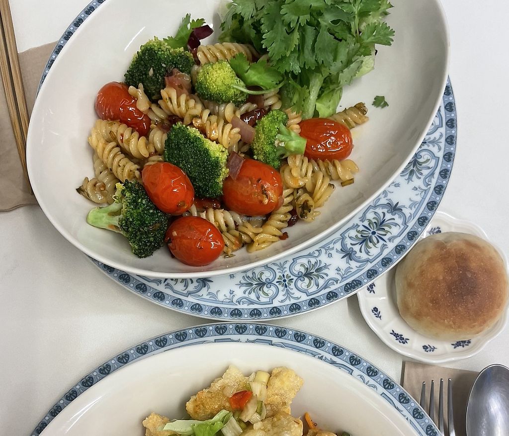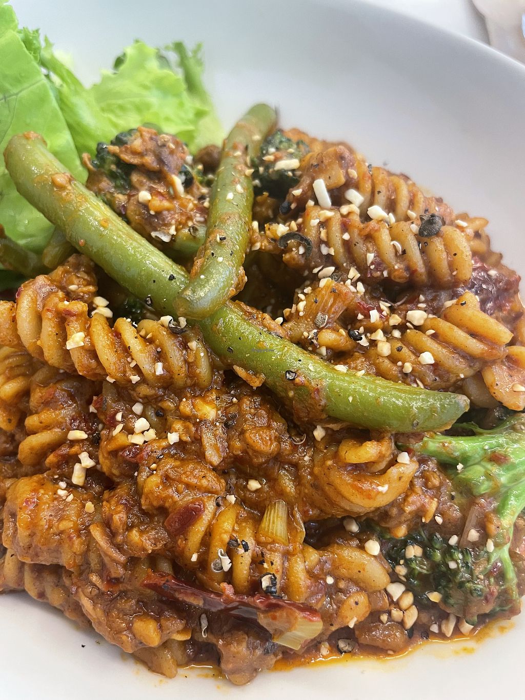 Today we went to Sunny Bowl and tried the Hummus Quinoa Salad and the “Bolonese” pasta :D. The meat substitute in the pasta was bean-based, and it also included lentils and eggplant. The pasta itself seemed to be whole grain, which personally wasn’t really my taste and was missing some salt.