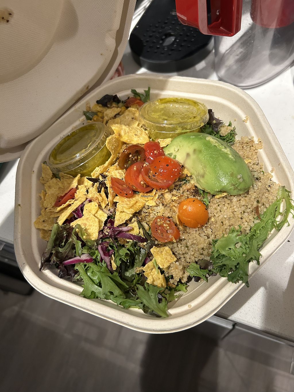 Serves meat, vegan options available. Part of the sweetgreen chain specializing in mixed bowls and customizable meals. Vegan options include the shroomami bowl, elote bowl (without goat cheese), and rosemary focaccia with hummus. Open Mon 10:30am-10:00pm, Tue-Sat 10:00am-10:00pm, Sun 10:30am-10:00pm. Peak wait times are around 18:00-19:00. I recommend ordering online and just picking up.