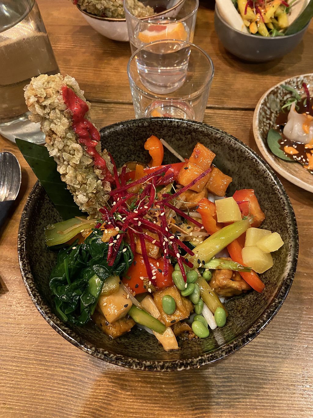 I had a noodle bowl and some dumplings. They didn’t exactly blow my mind, but I liked how fresh everything was. The noodle bowl was overall good, the crispy tofu stick could’ve used a little more salt/seasoning maybe. The dumplings were nice too. Would like to come back again to try other dishes on the menu!