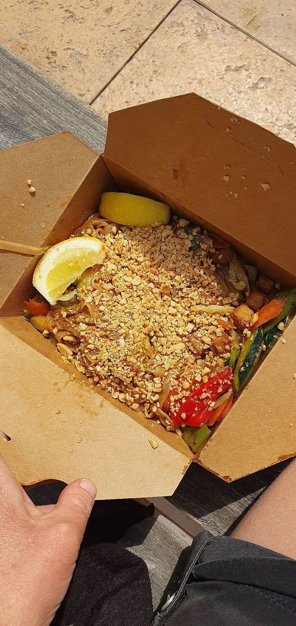 Serves meat, vegan options available. Thai restaurant with vegetarian dishes that can easily be made vegan upon request. Example offerings include pad thai, fried rice, vegetable stir-fry and more. Specify no egg or fish/oyster sauce when ordering. Open Mon-Sun 13:00-00:00.