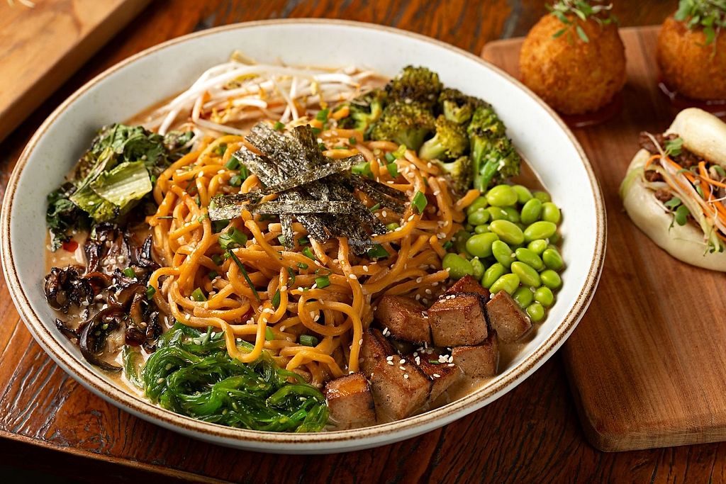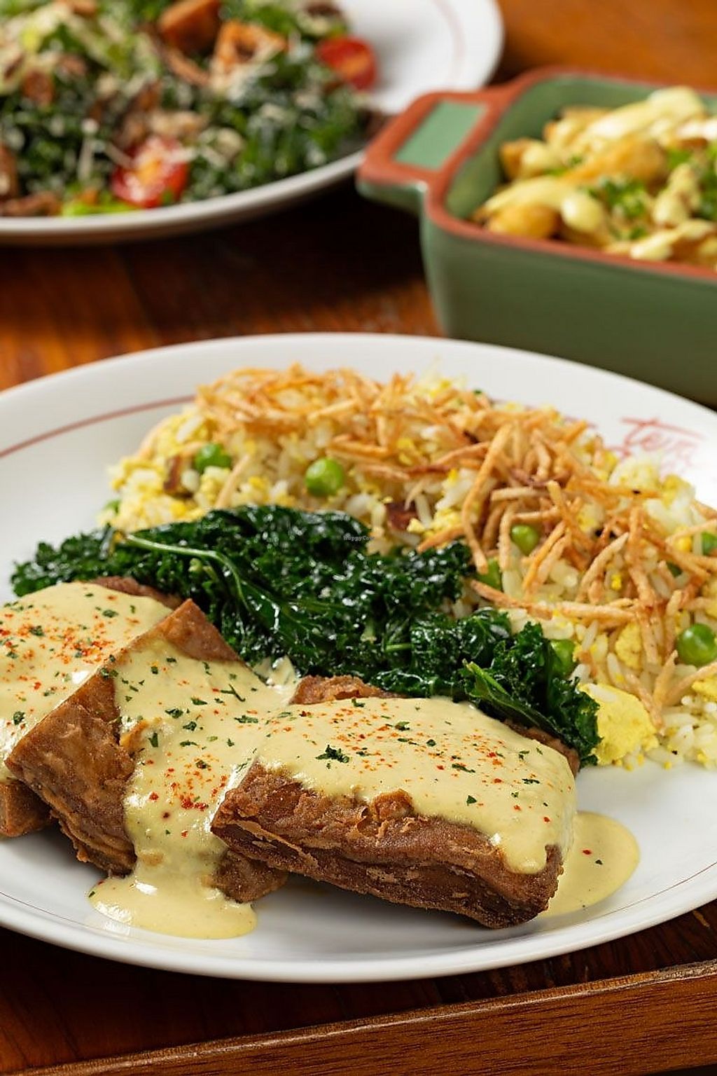 Black and white sesame seeds and rice crusted Uai tofu, black rice wit…