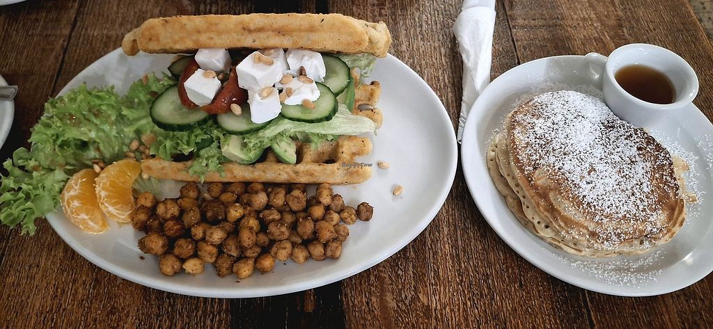 They have a vegan brunch which is a hummus avocado sandwich in between two waffles. And two pancakes on the side. Huge portions. They also had a vegan cake and plant milks for drinks