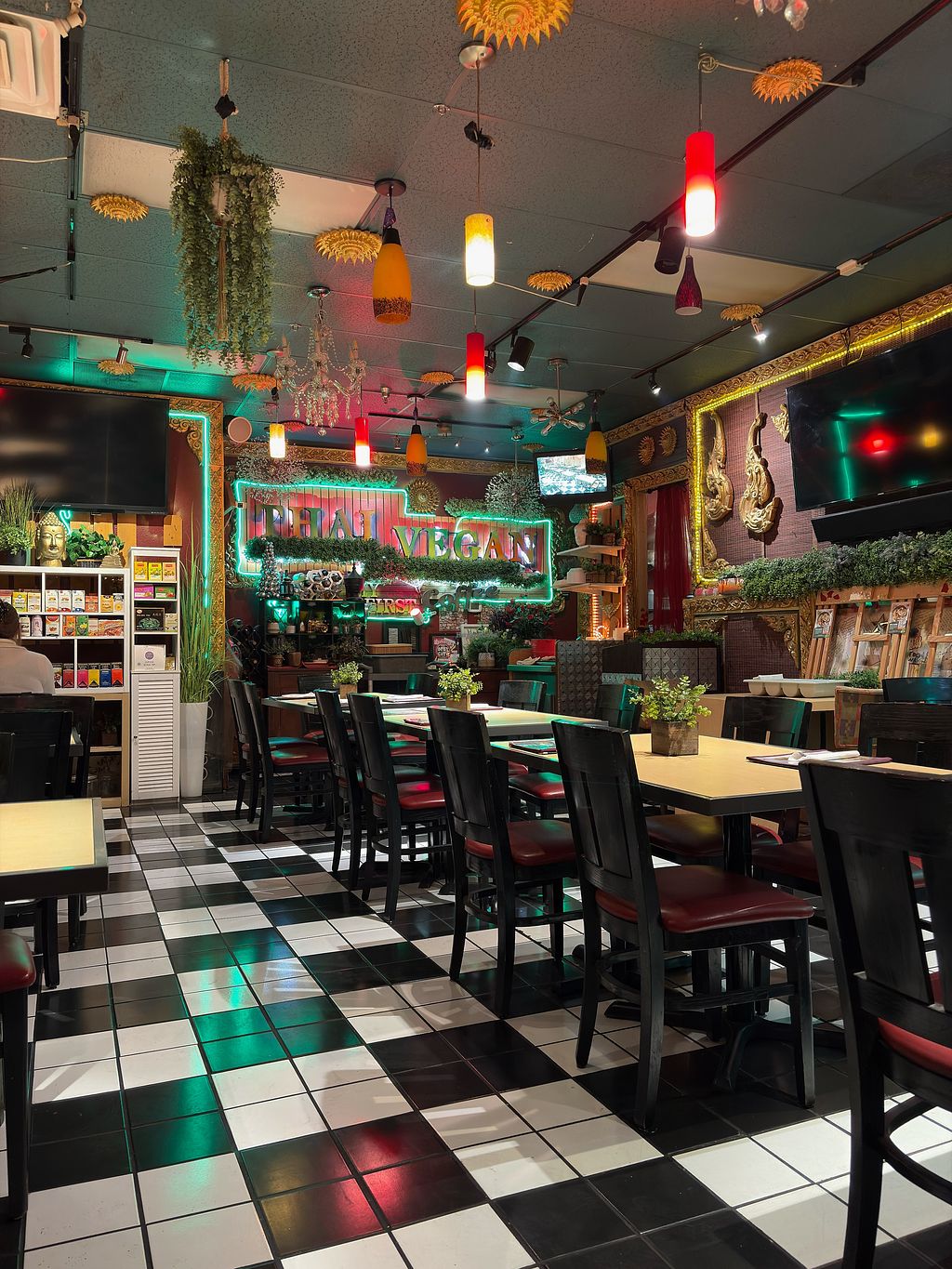 Offers primarily Thai food such as pad thai, larb, satay, curry, and orange "chicken" with choice of tofu or faux meats. Also veg burgers, wraps, salads, and fries. Casual atmosphere. NOTE: Please verify if still fully vegan. Open Mon-Sat 11:00am-8:00pm, Sun 5:00pm-8:00pm.
