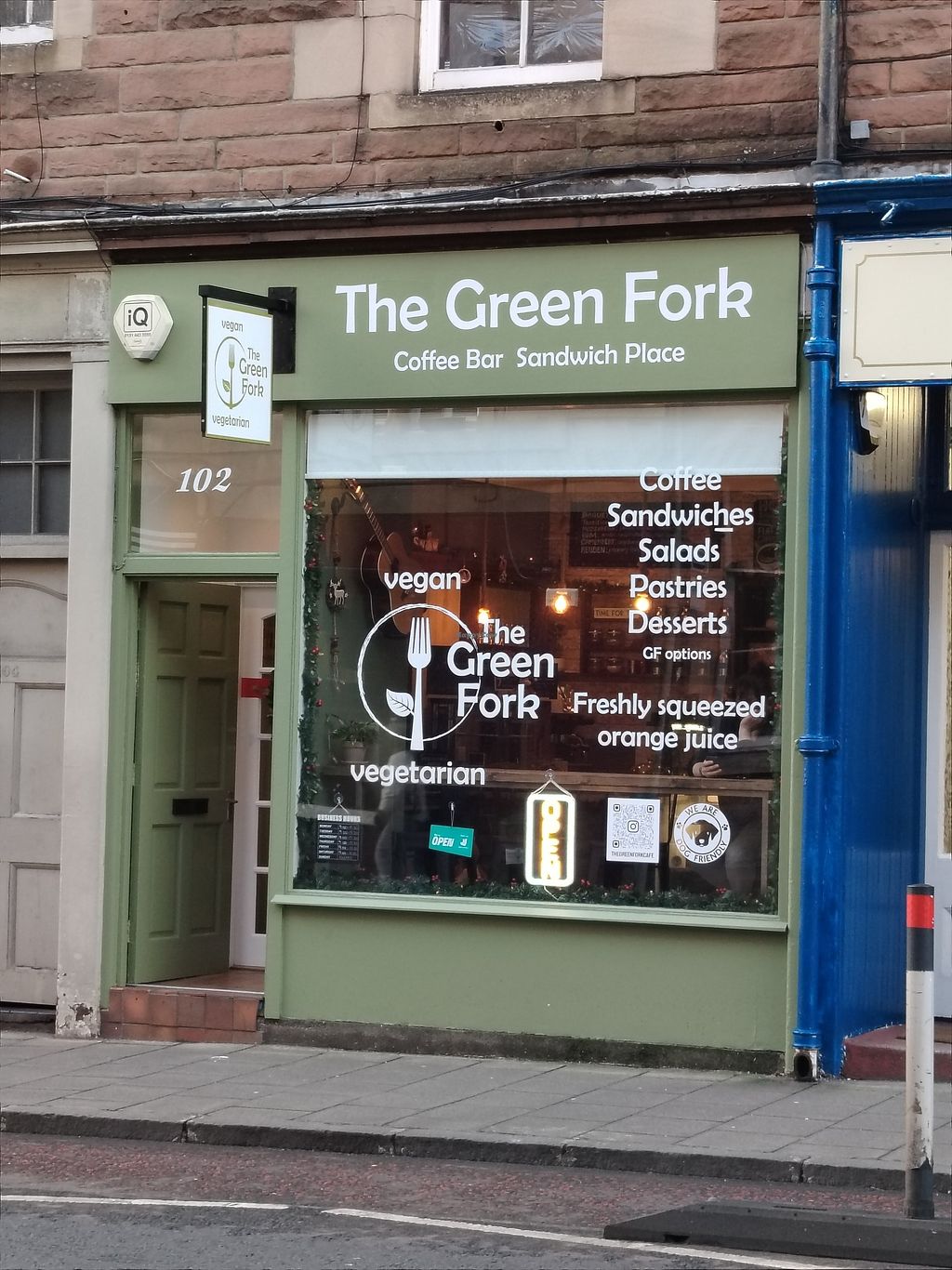 A small vegetarian café serving breakfast, lunch, and sweet treats, with a menu that is mostly vegan. The menu includes soup, a vegan spinach pie, and various sandwiches, such as a vegan club sandwich (with homemade vegan bacon) and a vegan sourdough sandwich. Open Mon-Sat 09:00-14:30.