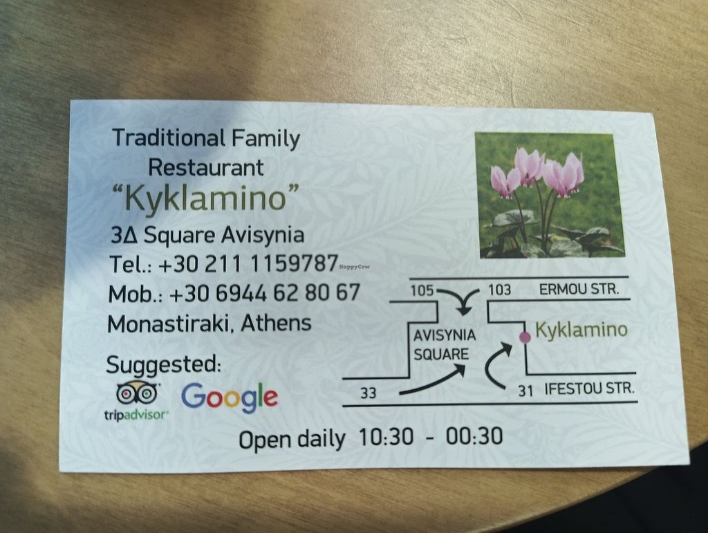 Serves meat, vegan options available. Traditional Greek restaurant with unlabeled but plentiful vegan options. Staff can assist with selection. Dishes include fava, horta (greens), fries, fried aubergine, and oven-baked large beans. Salads can be made vegan by omitting cheese. Inquire about stuffed vegetables as they may contain meat. Open Mon-Sun 11:00am-12:30am.