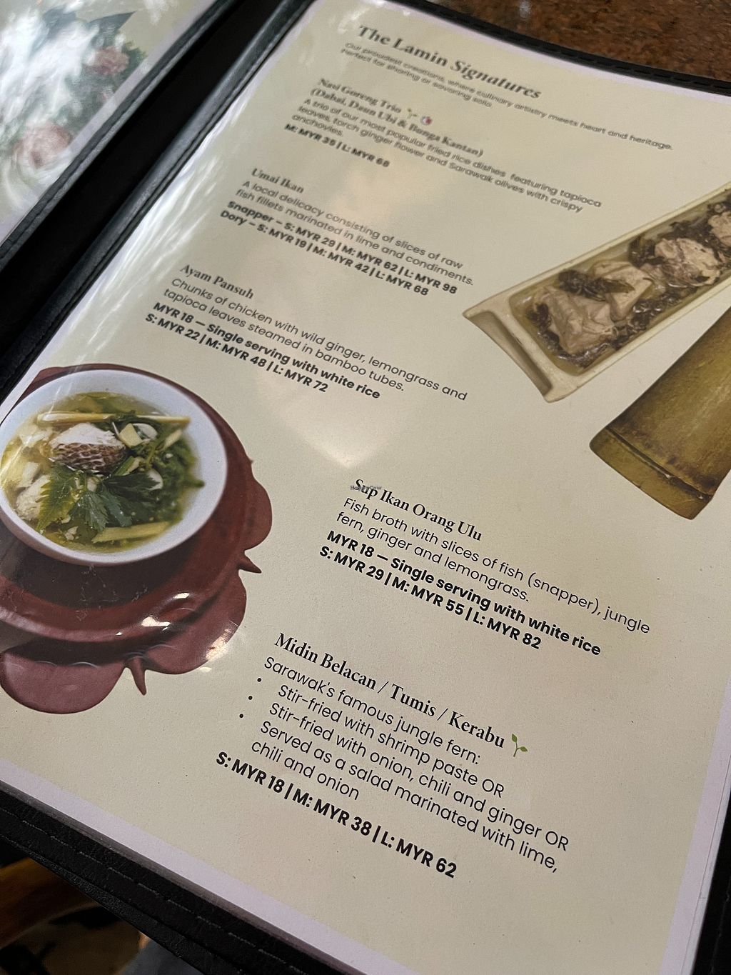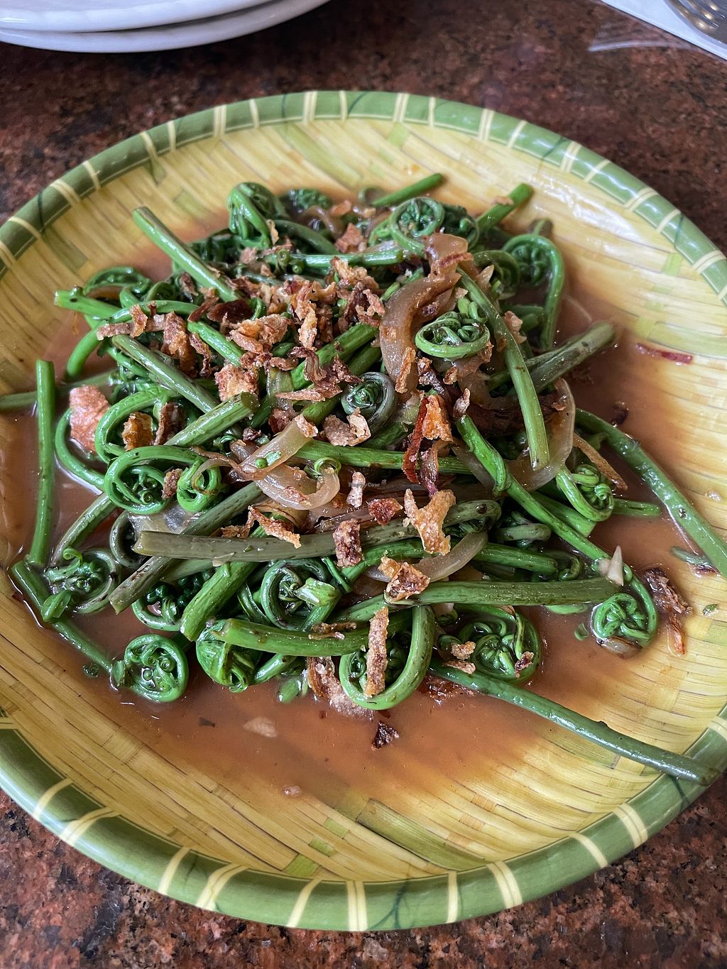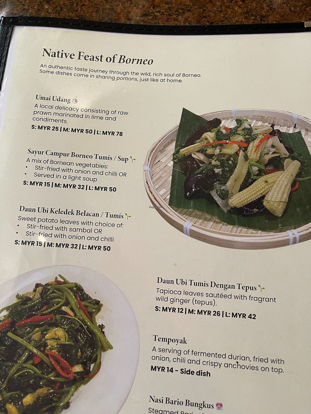 Serves meat, vegan options available. In-house restaurant at Telang Usan hotel which provides all-day dining. Vegetarian and vegan options are clearly marked., Vegan Bunga kantan tumis, bunga kantan kerabu, Nasi goreng daun ubi, nasi goreng bunga kantan, nasi goreng dabai, Midin Kerabu, rice dishes, stirfried vegetables. Open Mon-Sun 6:30am-11:00pm. n/a.