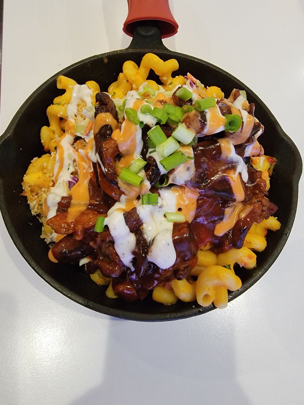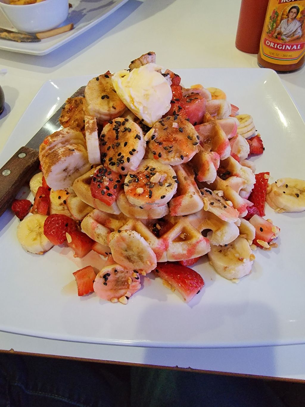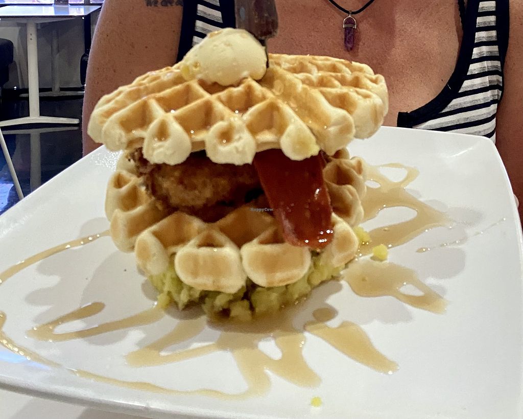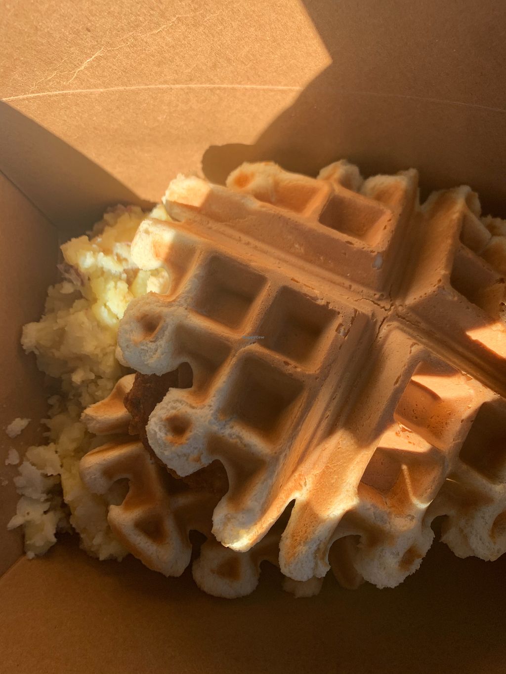Chicken & waffles served over mashed potatoes. The size of a birthday …