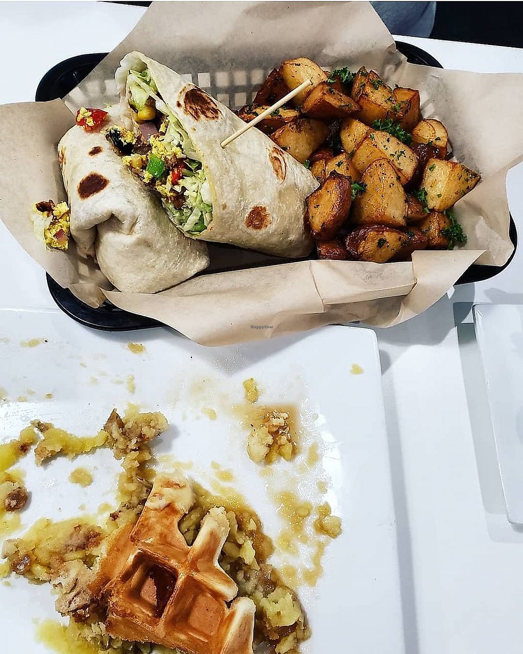 Devoured chicken and waffles next to the breakfast burrito