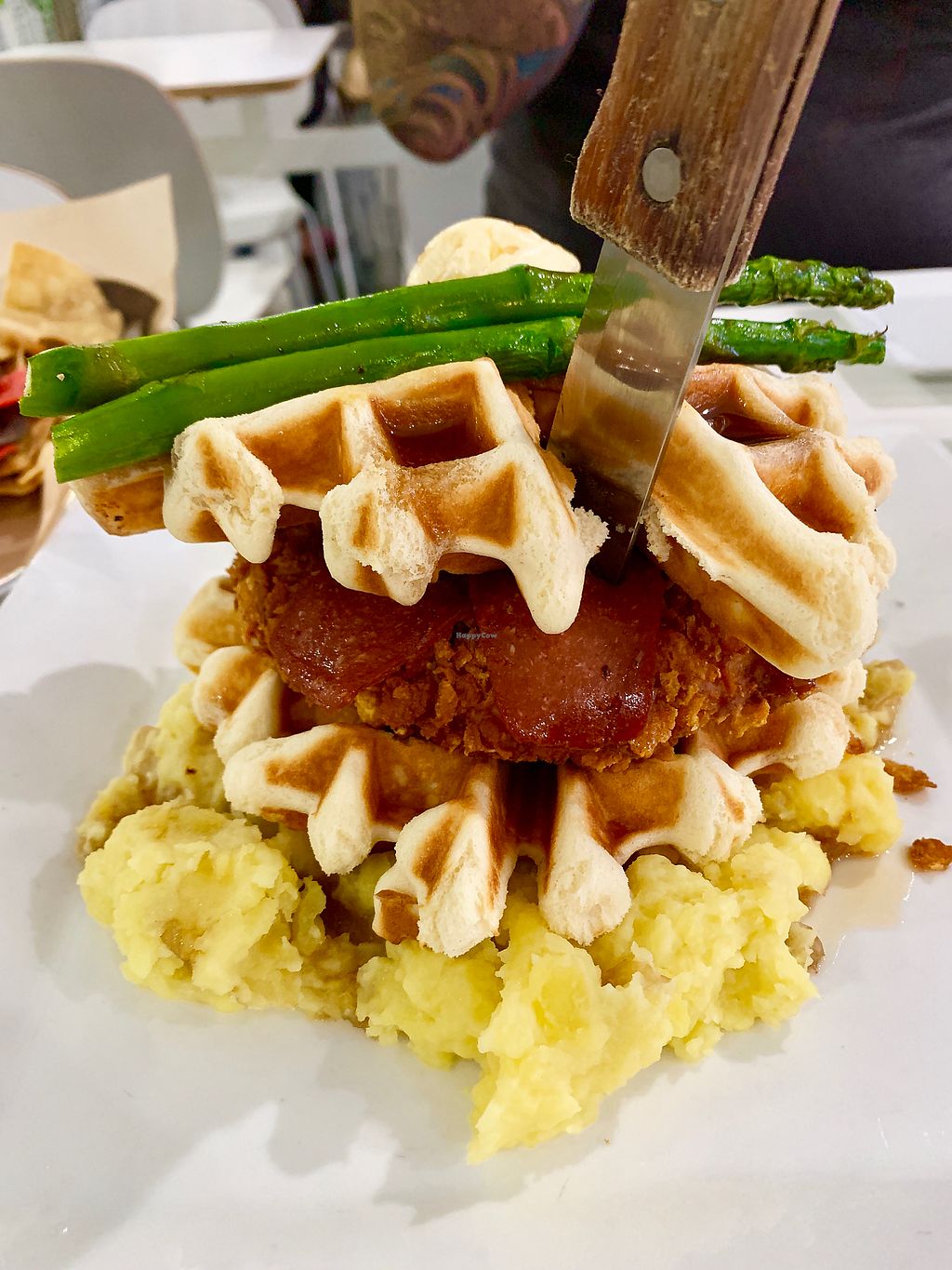 TMV has a huge menu and so many things looked good. Despite all the tasty looking lunch items, I was there for brunch so kept my focus there. I opted for the chicken and waffles and that was a great decision. I received a big fried "chicken" patty sandwhiched between two thick waffles, served on top of mashed potatoes (!) with syrup and butter. It was extremely excessive but delicious.