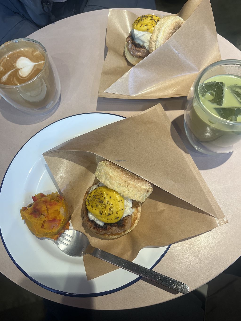 Grossartiger Frühstücksburger, Matcha und Macadamia Latte. Noch nie so eine gute Ei-Alternative gegessen! Wow