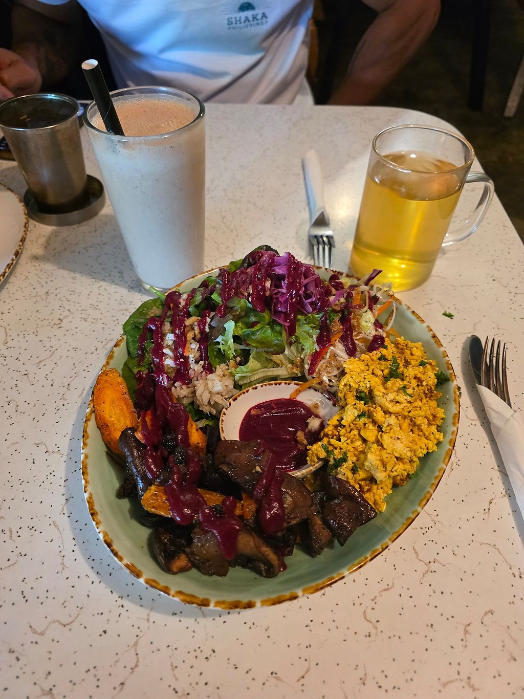 Groovy retro furnishings and delicious vegan food. Big vegan breakfast had scrambled tofu, mushrooms, roast veggies, spinach, grilled tomato, sourdough toast, and a hash brown. Forgot to take a photo