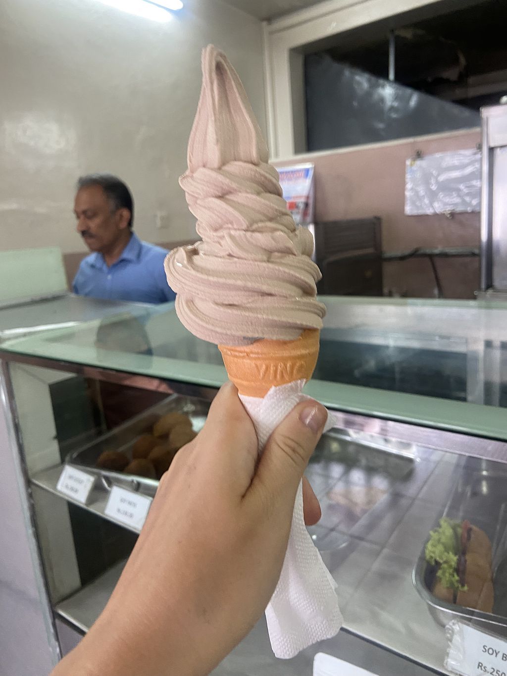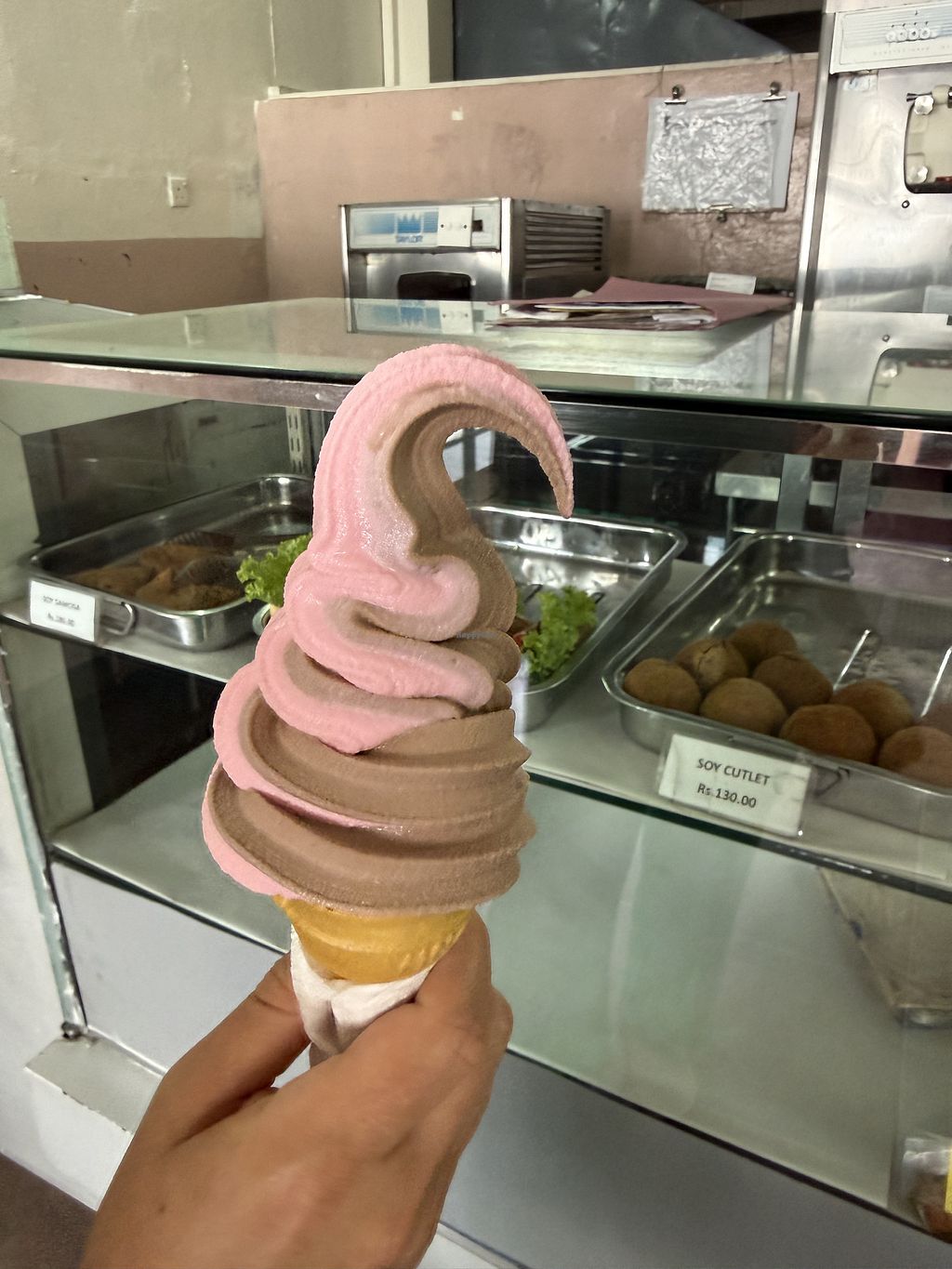 Cool to get vegan ice cream - it is salty but still nice. Soy bun and samosa nice also. Inexpensive 🌟