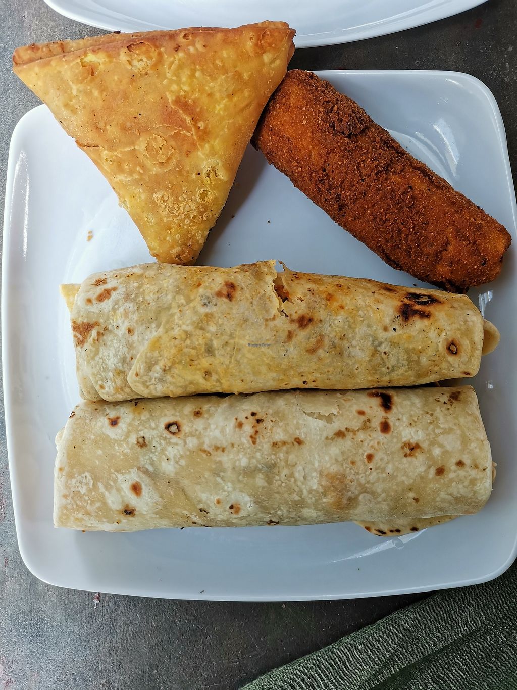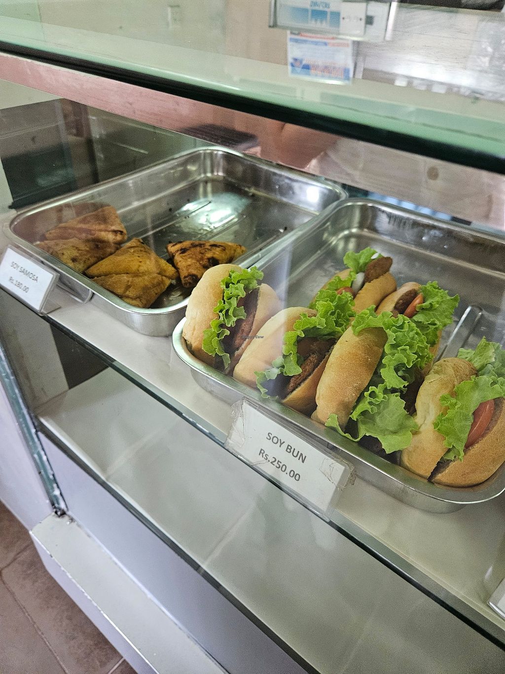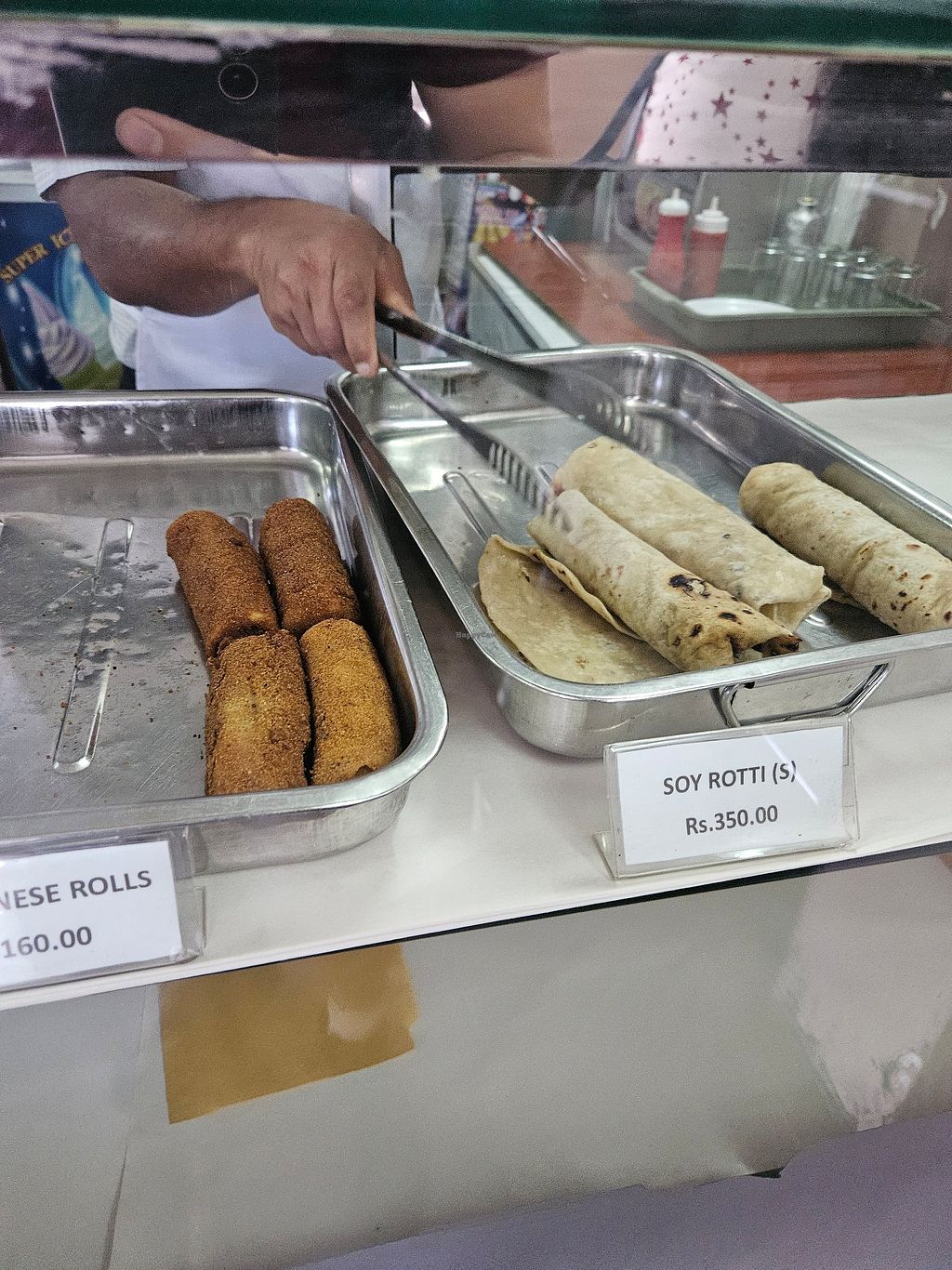 We had 2 soy rotti's, a soy chinese roll and a veg samosa. All had a good taste and a good fill for 2 people. Warmed up in the microwave before given to you.