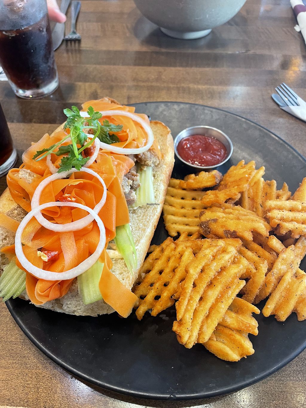 Tolle vegane Optionen. Ich hatte das Banh Mi mit popcorn chicken ohne Sides. Diese Knoblauchmayo/Sauce war eine der leckersten, die ich je gegessen habe 😍 absolut zu empfehlen