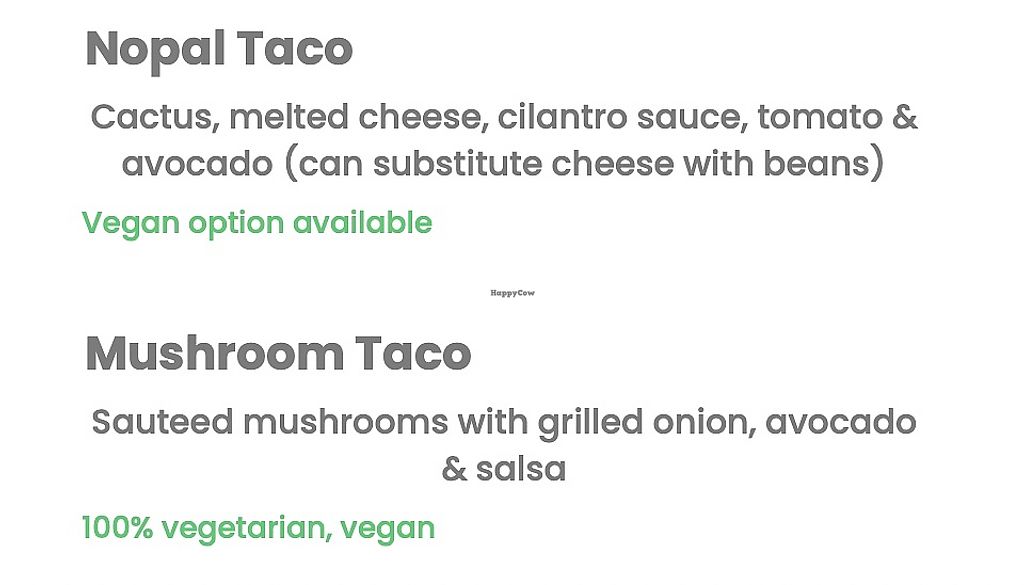 Lacto Mexican Non-veg Serves meat, vegan options available. Mexican restaurant offering two vegan options: nopal (without cheese) and mushrooms. Open Mon-Thu 11:00am-10:00pm, Fri 11:00am-12:00am, Sat-Sun 11:00am-1:00am. More
