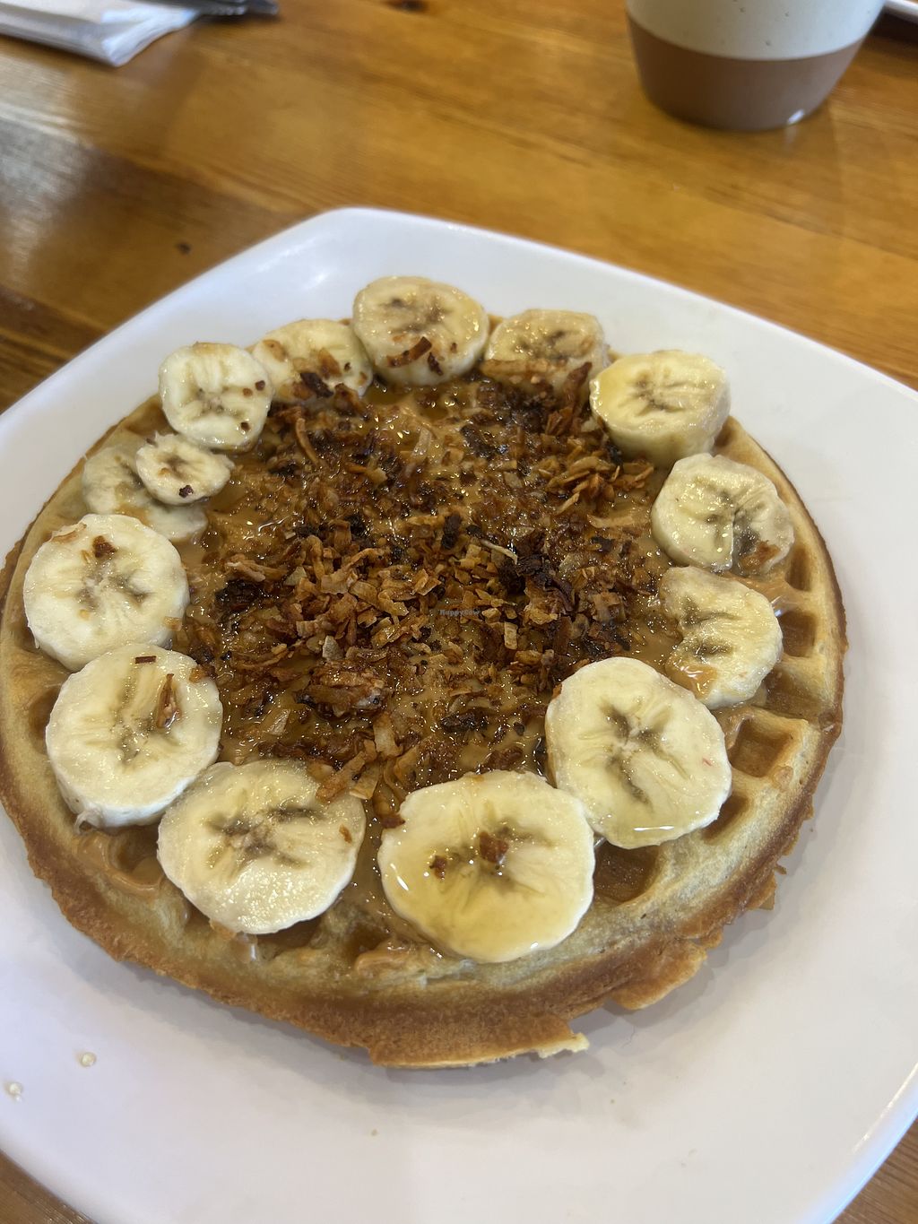 Serves meat, vegan options available. Breakfast, lunch, smoothies, and dessert all day. The guru waffle burger and blendies are vegan as is. Menu has a "V" for items that offer vegan cheese or baconut as plant-based substitutions. Open Mon-Thu 7:00am-5:00pm, Fri-Sat 7:00am-7:00pm, Sun 7:00am-5:00pm.