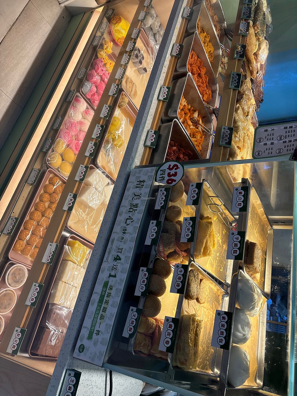 Vegetarian takeaway counter selling savories, mock meats, sweet buns, herbal drinks, and more. Mostly vegan apart from possibly the mock meats. Vegan dishes include veggie bbq pork bun 叉燒包; veggie shumai 燒賣; veggie spring rolls 春卷; veggie radish cake 蘿蔔糕; pan-fried veggie buns 素菜煎包. Open Mon-Sun 7:30am-9:30pm.