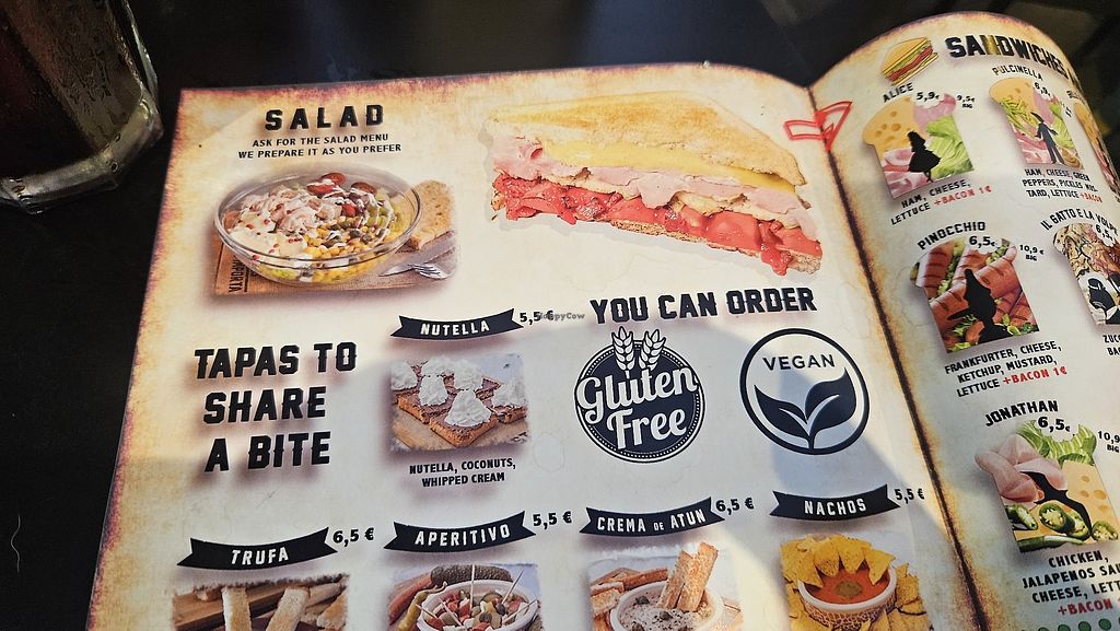 Serves meat, vegan options available. Offers toasties and drinks with vegetarian and vegan options. All vegetarian sandwiches can be made vegan by swapping to vegan cheese. Vegan toppings include grilled aubergine, courgette, tomato sauce, and basil. Some tapas may also be made vegan. The menu is clearly labeled to accommodate vegans. Open Tue 06:30-12:30, Wed-Thu 18:30-00:30, Fri 18:30-01:00, Sat-Sun 18:30-01:30. Closed Mon & Sun.
