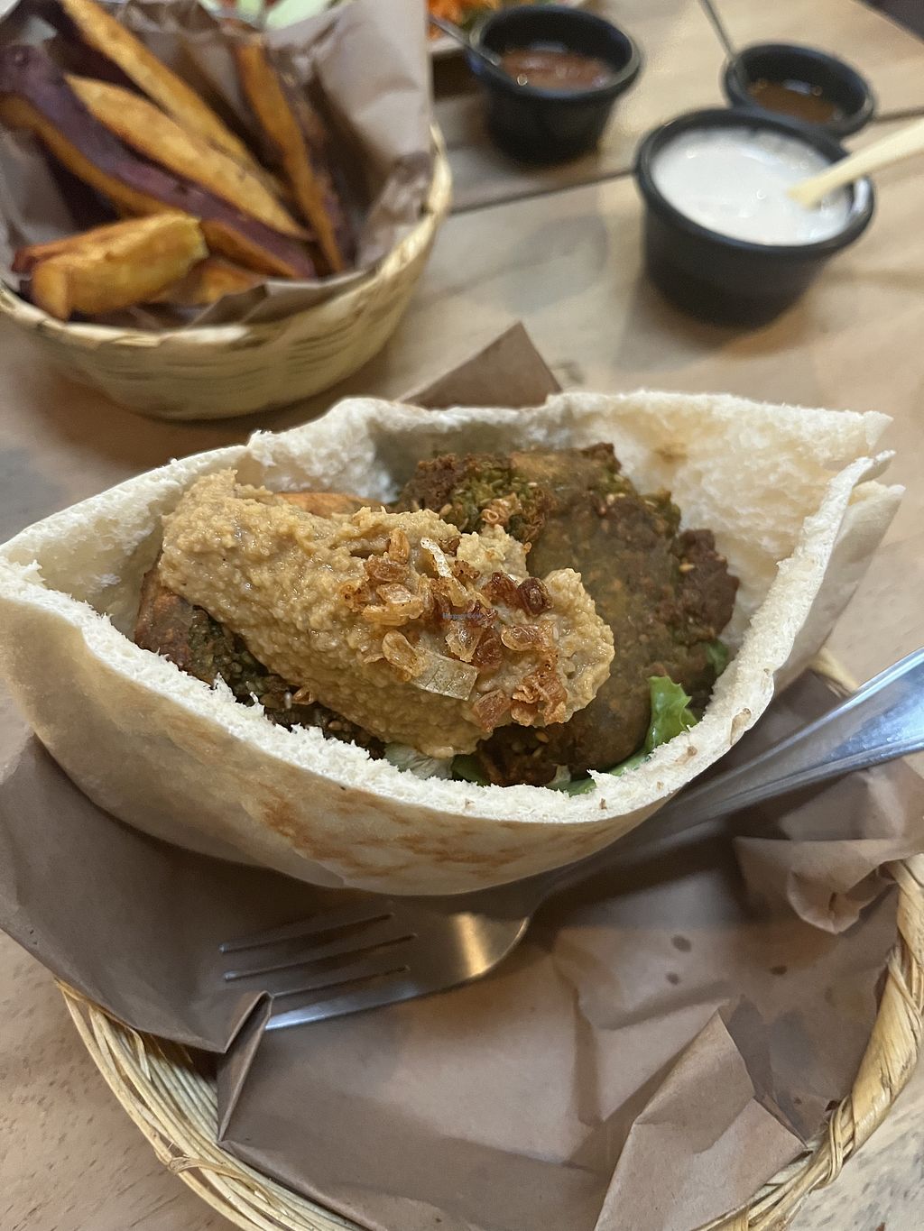 Large portions at a good price. I had the falafel wrap and sweet potato fries.