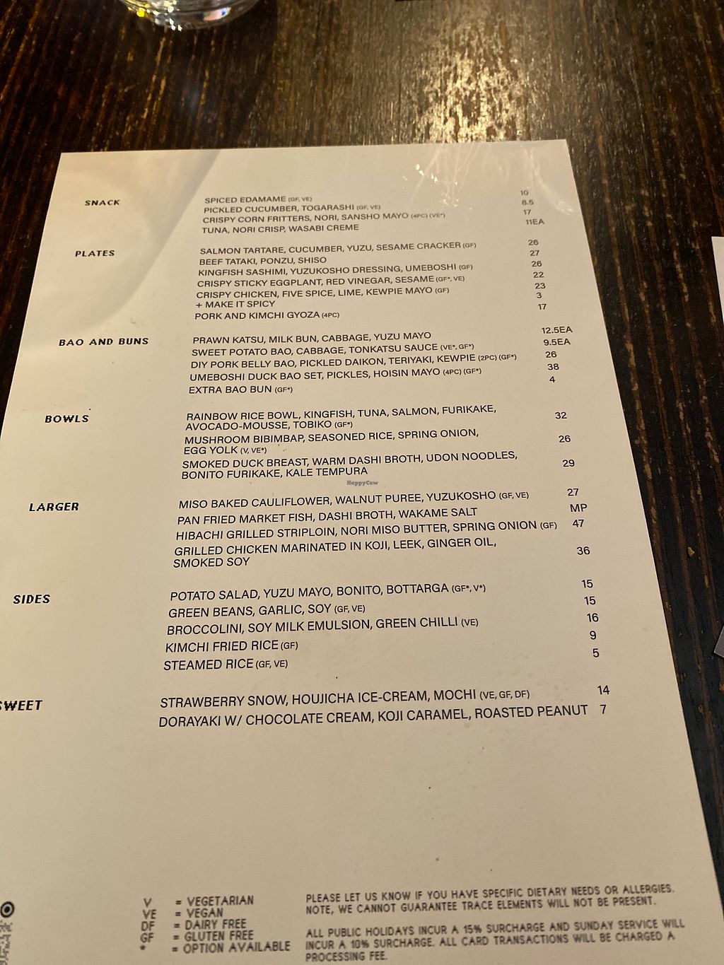 Serves meat, vegan options available. Japanese restaurant offering a few labelled vegan items such as starters, bao, miso baked cauliflower, sides, dessert and more. Open Mon-Sun 5:00pm-10:00pm, Fri-Sun 12:00pm-4:00pm.