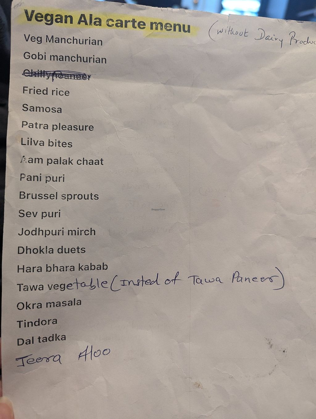 We enjoyed trying this new, all-vegetarian Indian restaurant. Servers brought us a separate list of menu items that were either vegan or veganizable (of which there were many).