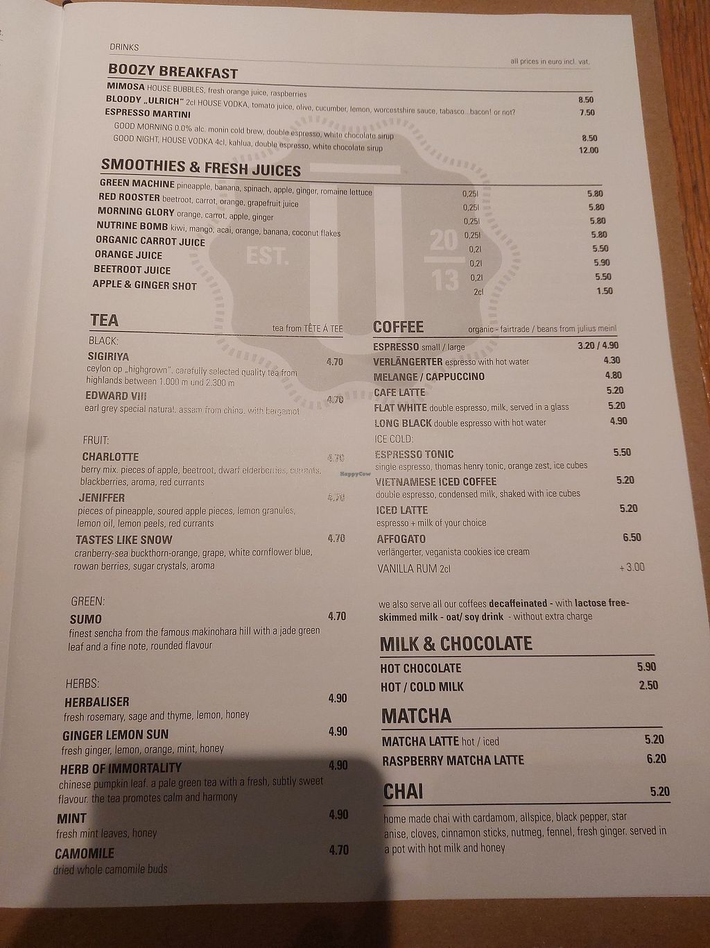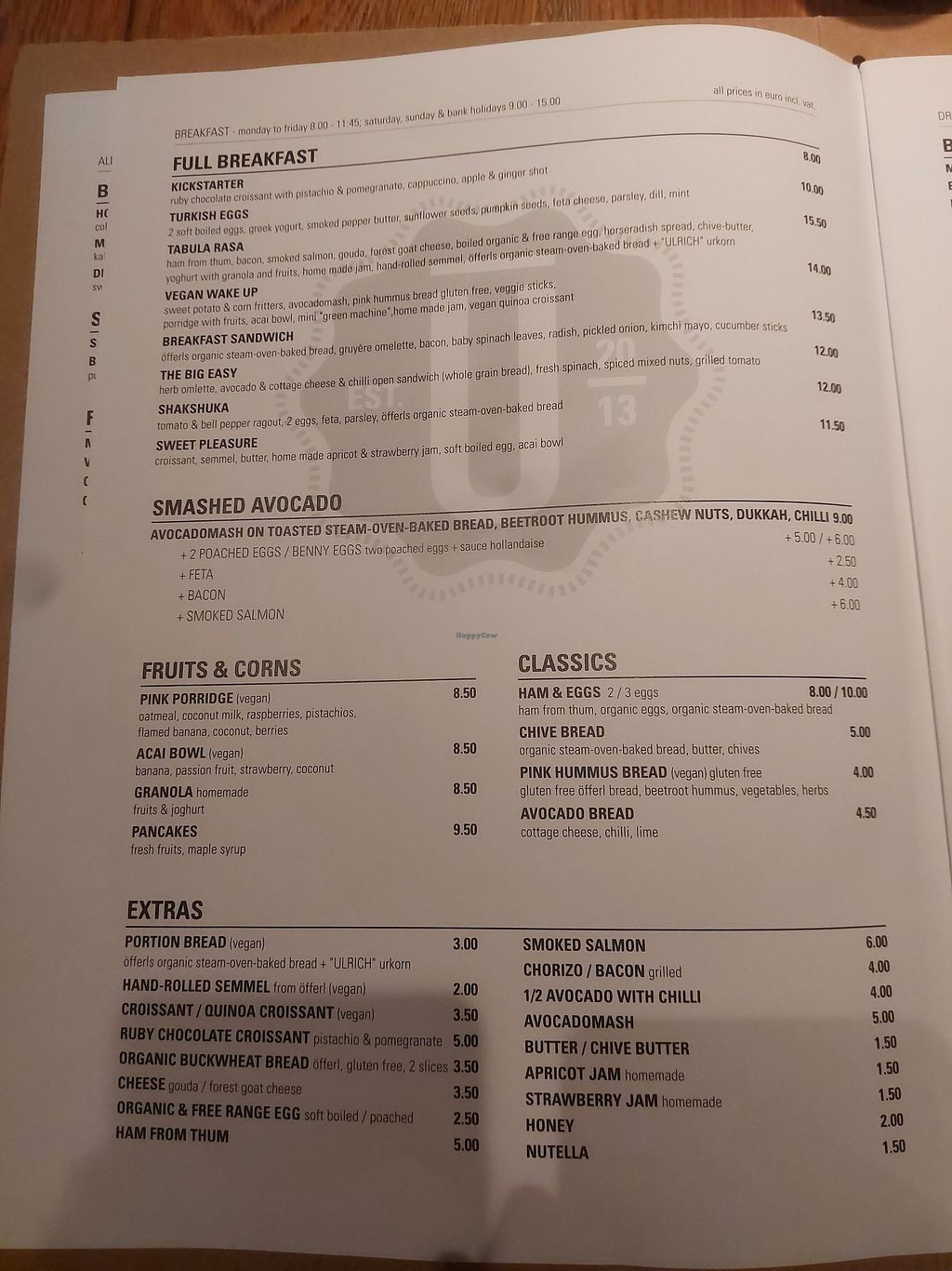 Read moreUlrich does a fantastic vegan breakfast plate filled with an assortment of goodies, most notably a fried fritter type thing which is to die for. It also has very vegan friendly hot drink options and a selection of plant milks to choose from.