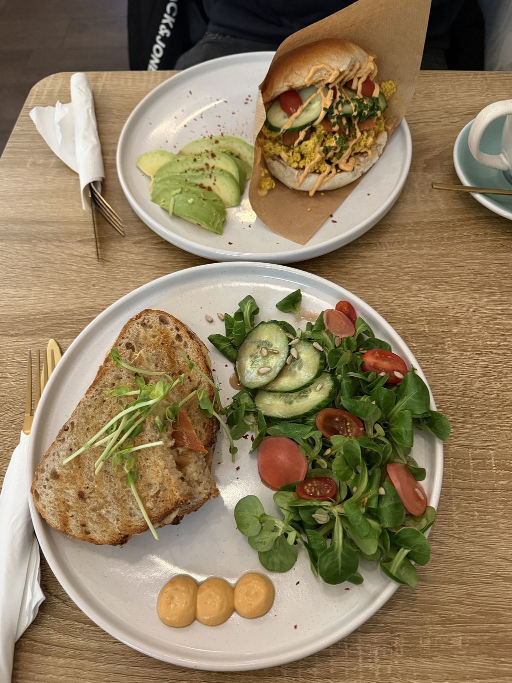 I had the Grilled Cheese Sandwich. The sandwich was excellent - grilled sourdough bread sandwich with vegan cheese and onions. The bread was perfectly soft and crispy. The sandwich was served with a salad, which was great, too. We sat outside in the backyard - the atmosphere was really nice, we witnessed the green of the blooming garden close-by. The staff was friendly. No menu on the tables, it was available only online, yet not up-to-date, which was a bit confusing: Online it said, waffles were not available, at the counter they told us they were, but the online menu hadn't been updated. The coffee with oat milk was very good.