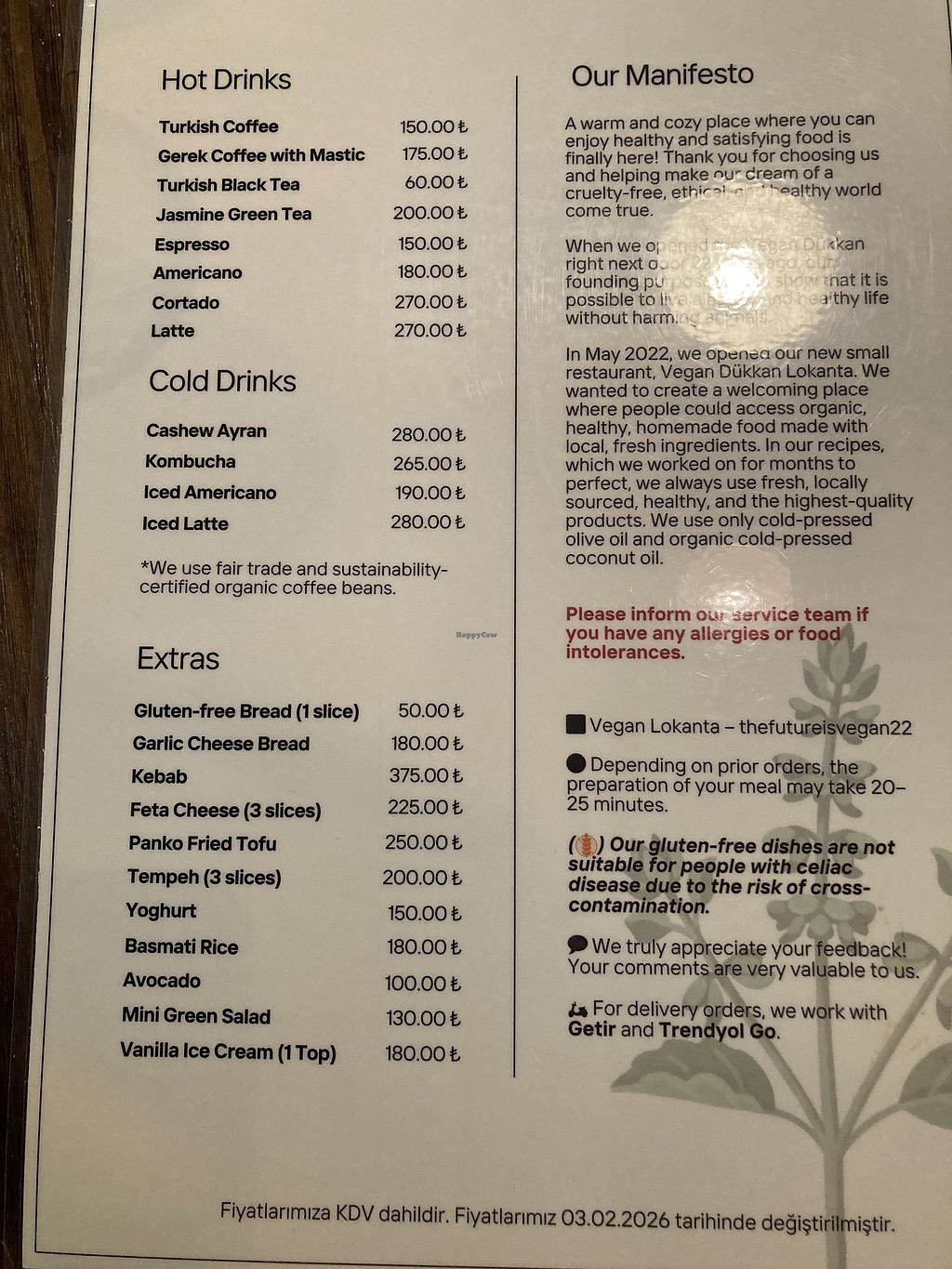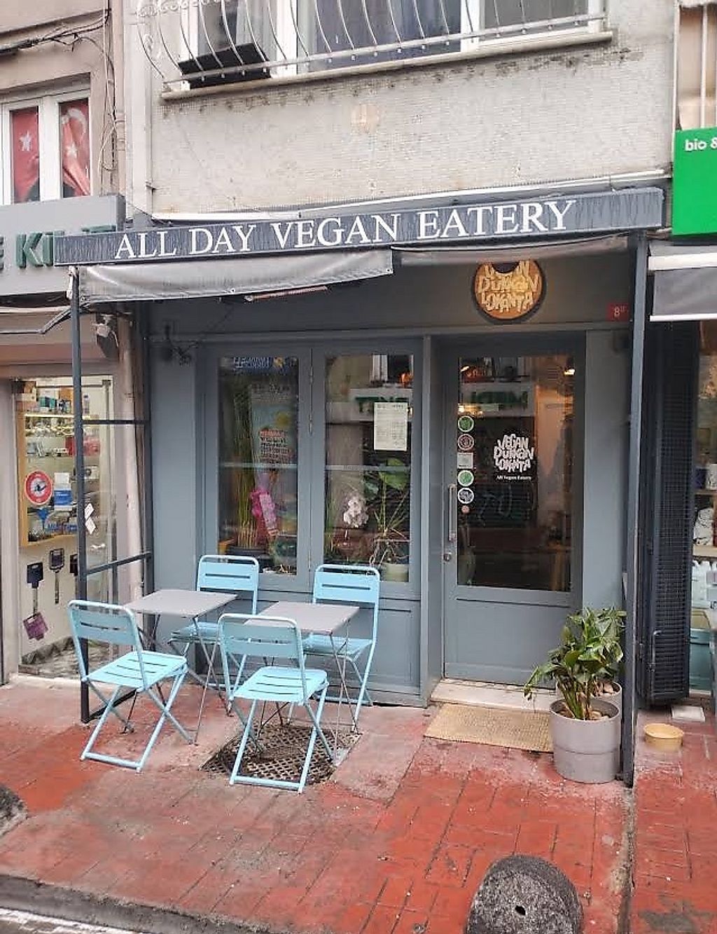 Opened May 2022. This all-vegan eatery is the sister company of Vegan Dukkan, the first vegan market in Turkey. Located in the heart of the city in the vibrant and hip Cihangir area. Both are owned by a vegan and operated by a vegan team. Cozy interiors will warmly welcome you at the door. Uses clean, local and organic ingredients. Menu includes allergy friendly items and a major selection of gluten free dishes as well. Some offerings are breakfast, soup, salad, zucchini pizza, wraps, tofu katsu curry, spaghetti, toasts, cakes and more. Open Mon-Sun 10:00am-9:00pm.