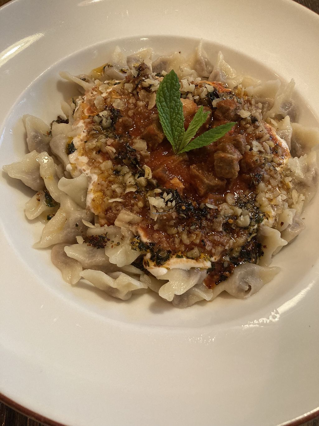 We sat outside the tiny restaurant and didn't know what to order, as everything on the menu looked good. The Special Turkish Ravioli (mantı) with fermented cashew yoghurt, vegan meatballs, tomato sauce and walnuts were fantastic. The soup of the day was made of cauliflower, came with garlic bread, and was also very good. The portions were generous, so we have to come back for dessert. We also got complimentary flavoured water.