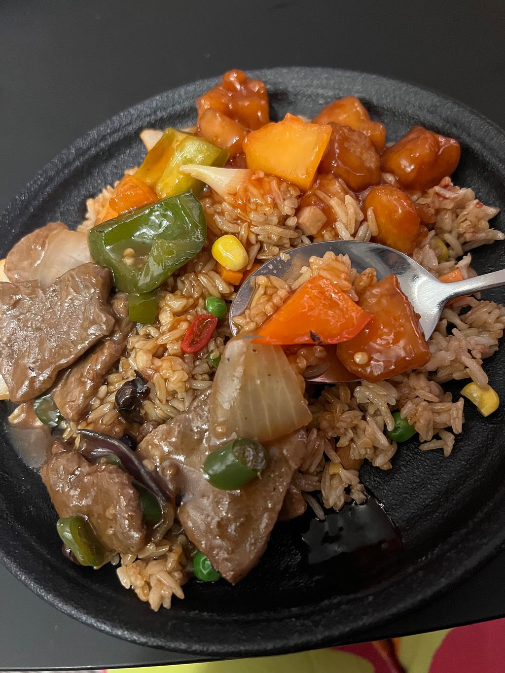 For our mains we were greedy as this was our first time, spicy wontons (amazing!) sweet and sour "chicken" and spicy black bean "beef" with special fried rice and white rice. The black been "beef" didn't have much punch but everything else was really great.