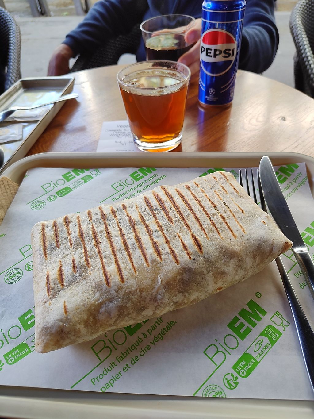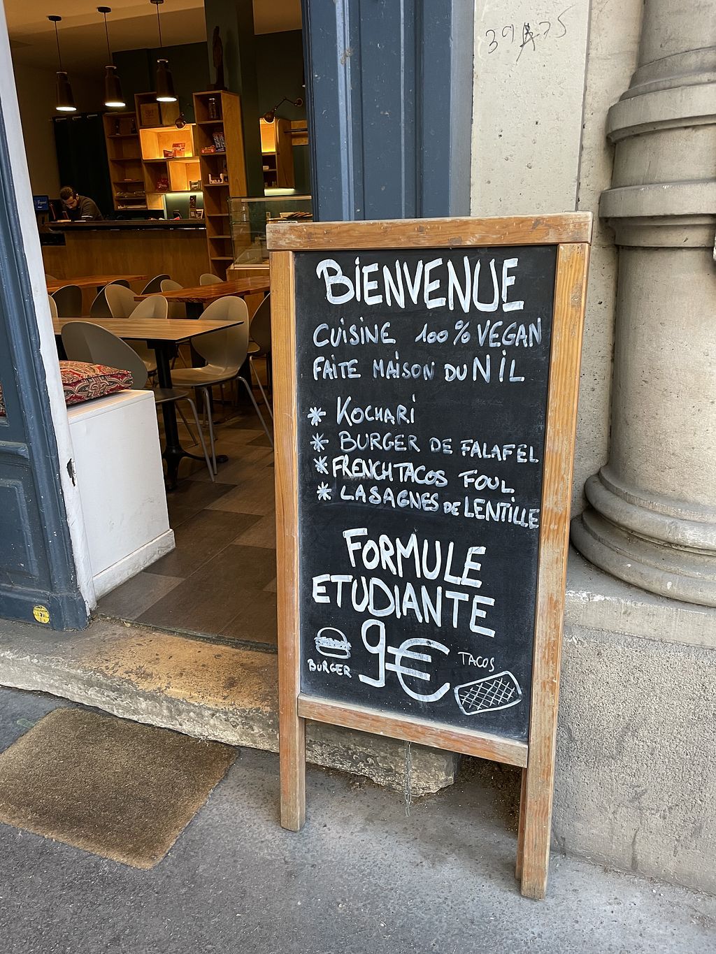 Egyptian vegan food, it was very good. They have menus for a wrap and a drink 13-15€. Student discounts only for French students. Would recommend!