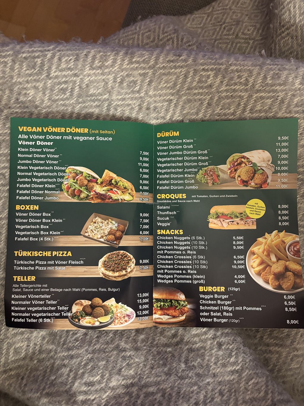 Serves meat, vegan options available. The menu features a variety of vegetarian and vegan meals. Key vegan options include the Vöner Döner (made with Seitan or Falafel), which can be ordered as a full Döner sandwich, Dürüm (wrap), or as a plate. Other vegan options include the Vöner Salad and Falafel Salad. Open Mon-Fri 07:00-21:00, Sat-Sun 09:00-21:00. Closed Mon.