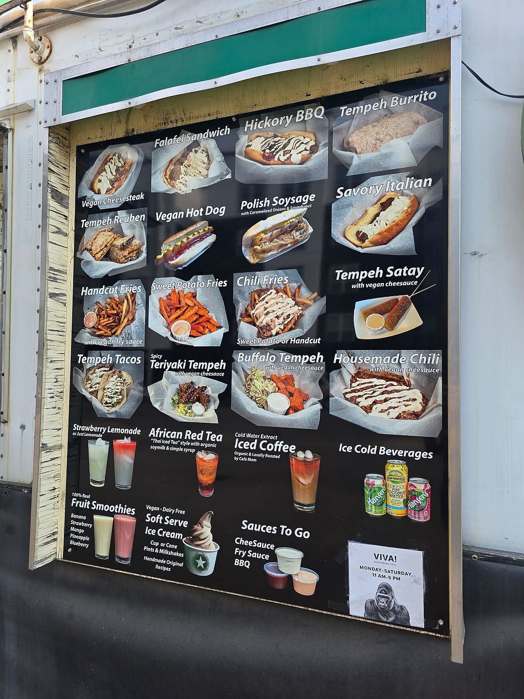 Vegan fast food cart selling veggie dogs, soysages, cheesesteaks, tempeh reuben, tempeh satay, sweets, organic juice, tea, and coffee. Weekly specials. Check webpage for updates & changes. Take-out only. Open Mon-Sat 11:00am-5:00pm.