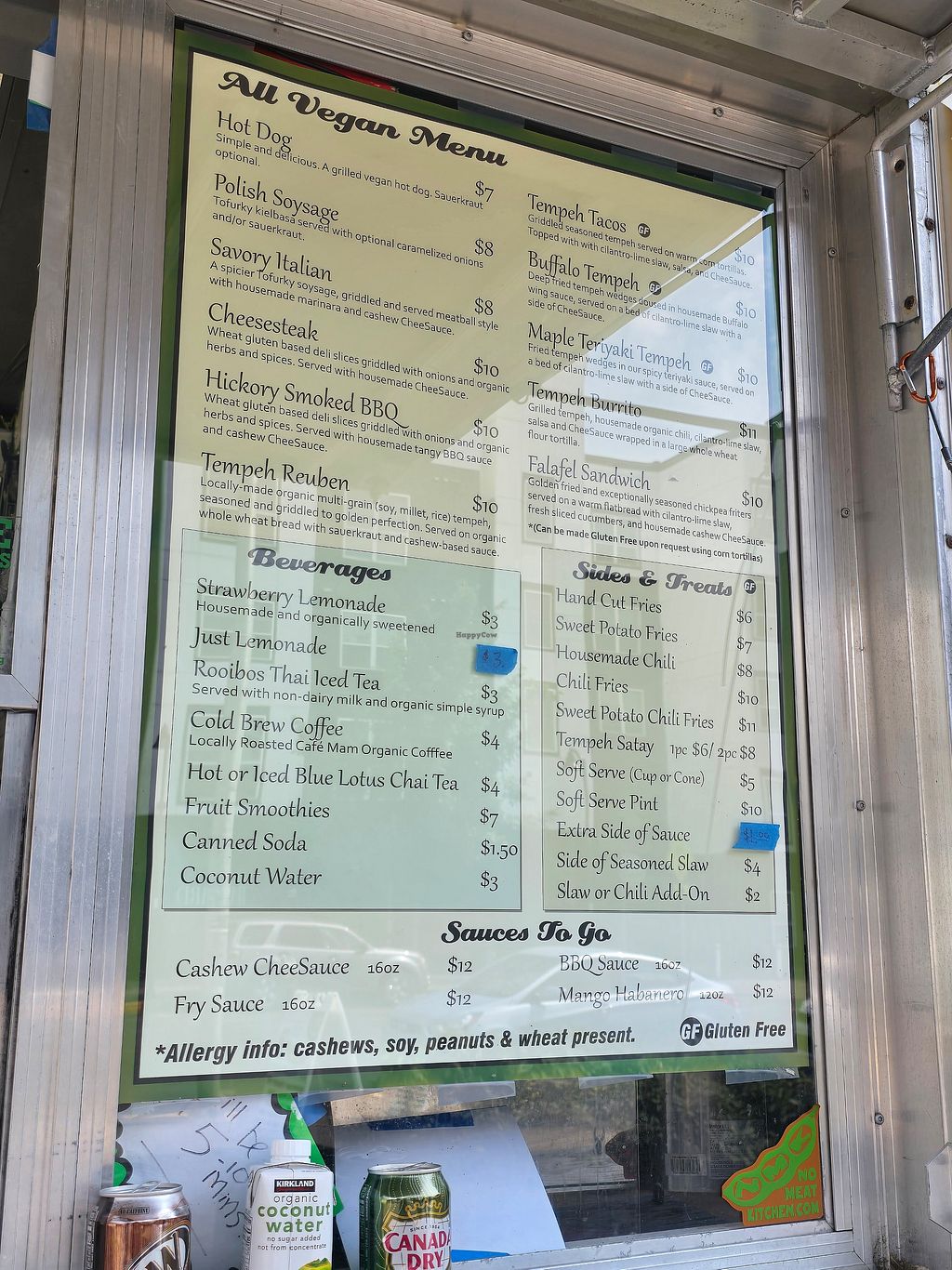 They have some outdoor seating near the food truck. Other options on the menu include housemate chili, falafel, vegan cheesesteak, tempeh tacos, sweet potato fries, polish soy sage, and several more options.