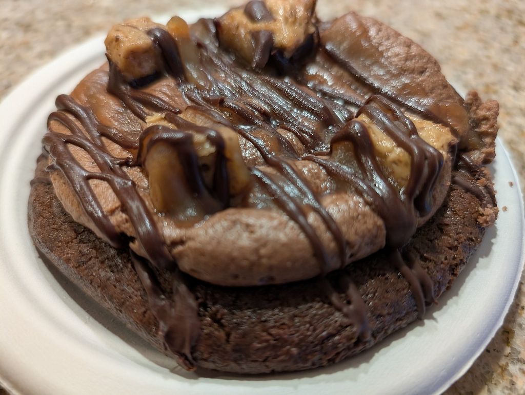 Chocolate cookie with chocolate frosting, peanut butter chunks, and Ca…