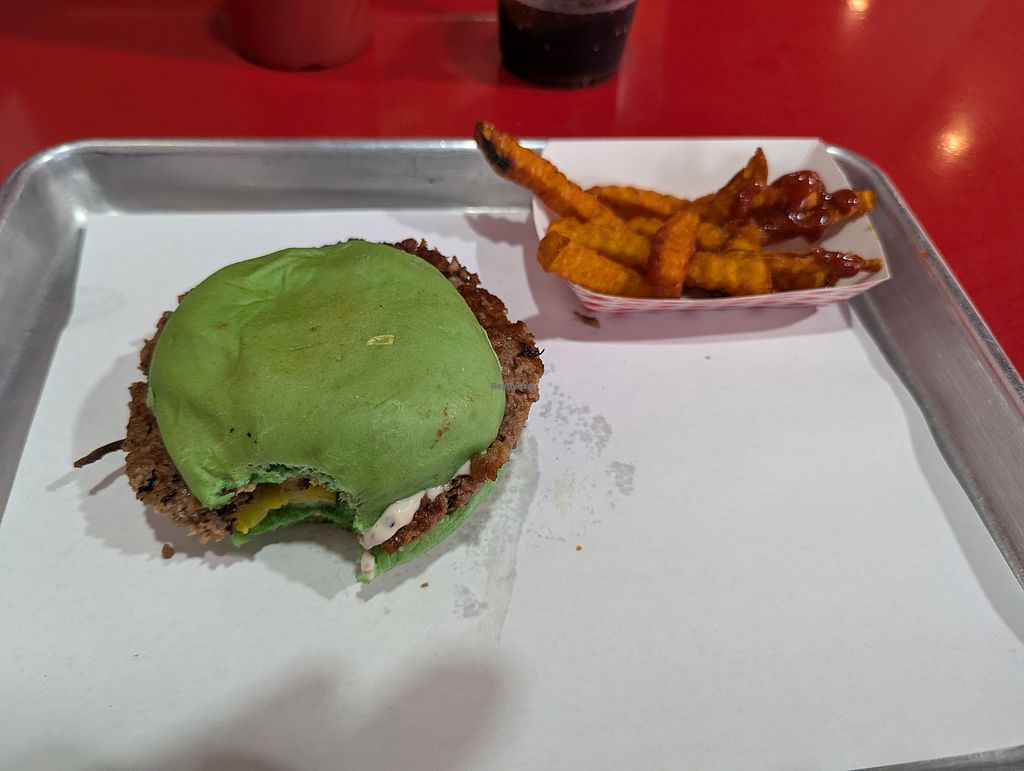Best burger, vegan or not, that I’ve had in my life. Service was fast and friendly. The green buns are vegan burgers, RED BUNS ARE NON-VEGAN! They even have an excellent vegan cheese that comes on it! Not a lot of seating, don’t expect to get a table at dinner time. Order at the counter style.