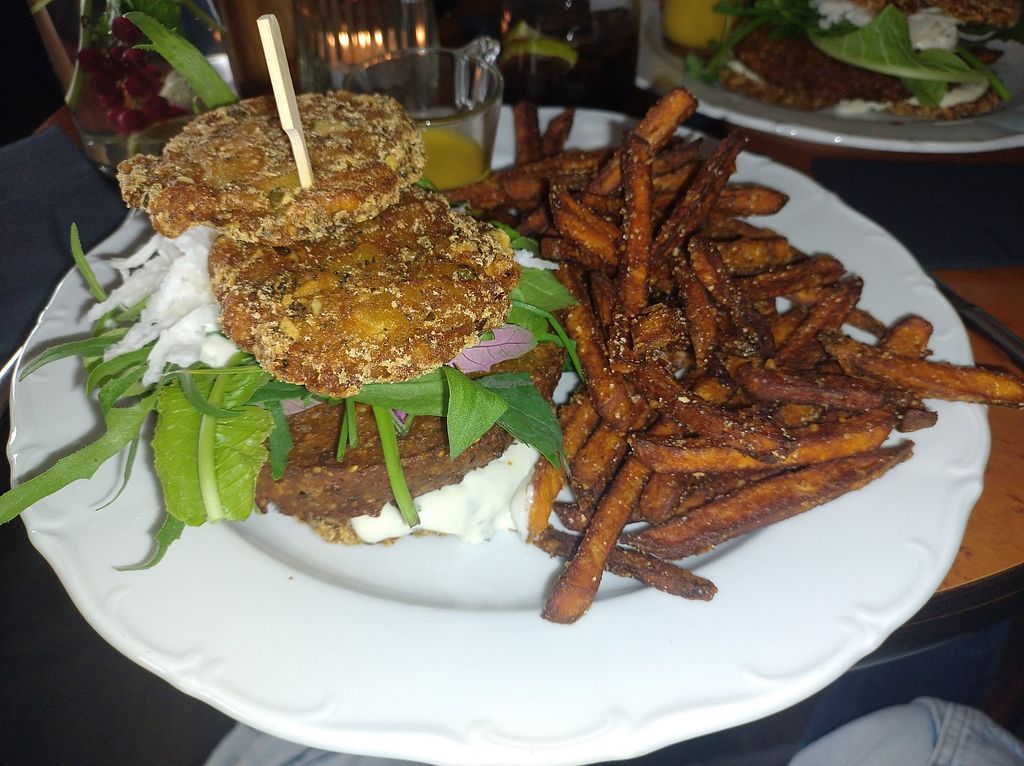 Die vegane Auswahl ist nicht groß (zwei Hauptgerichte), aber sehr lecker. Wir haben uns für den Burger entschieden, der zwar ganz anders als erwartet war, aber dafür wirklich sehr lecker. Zwiebel-Rösti (statt Brötchen) mit einem Haferflocken-Erbsen-Patti, Salat und pflanzliche Joghurtsauce, dazu Süßkartoffel-Pommes. 23 Euro ist auch ein stolzer Preis, aber das Essen war definitiv jeden Cent wert.