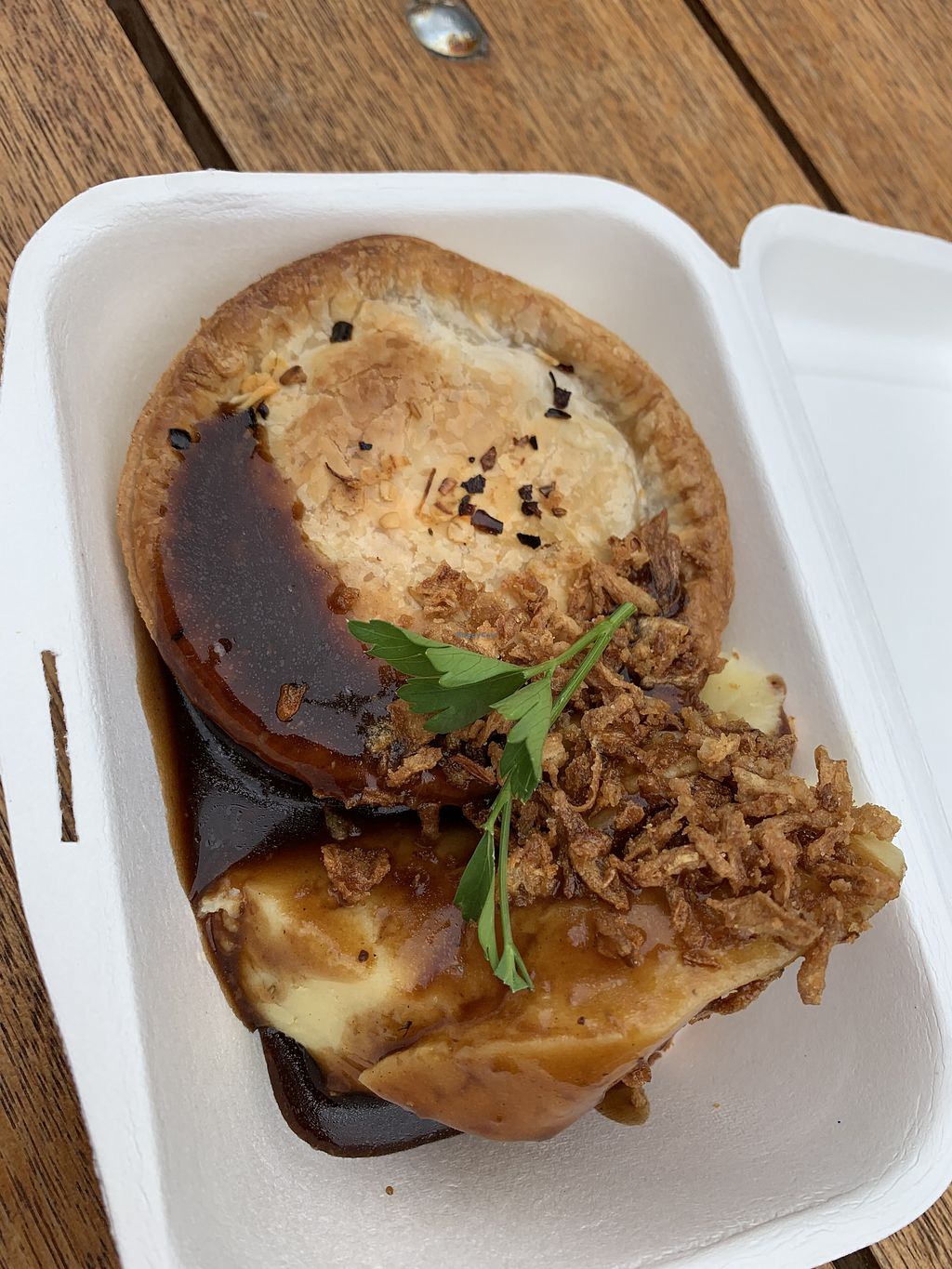 Steak and ale pie with mash, mac’n’cheese, gravy, and crispy onions