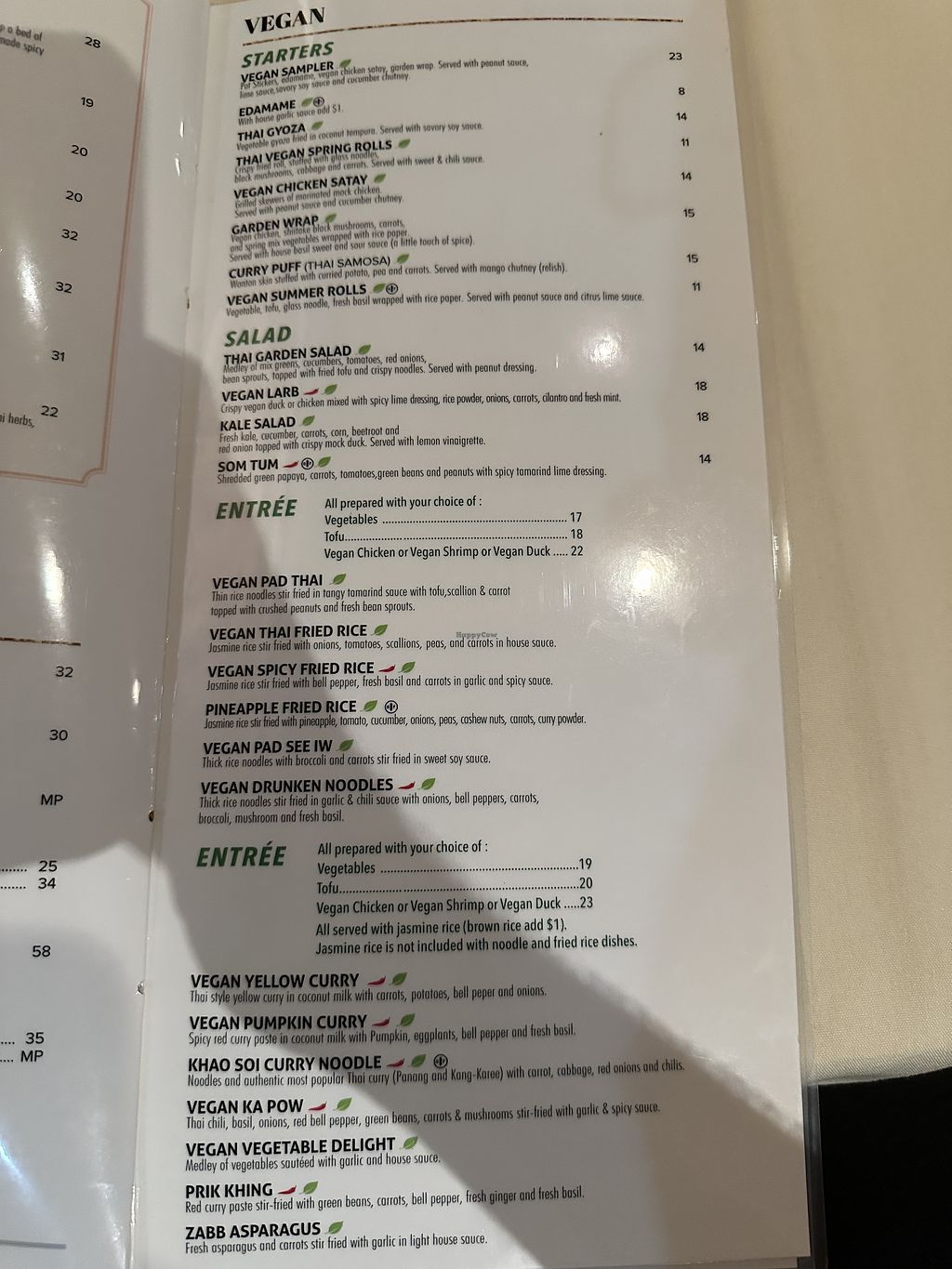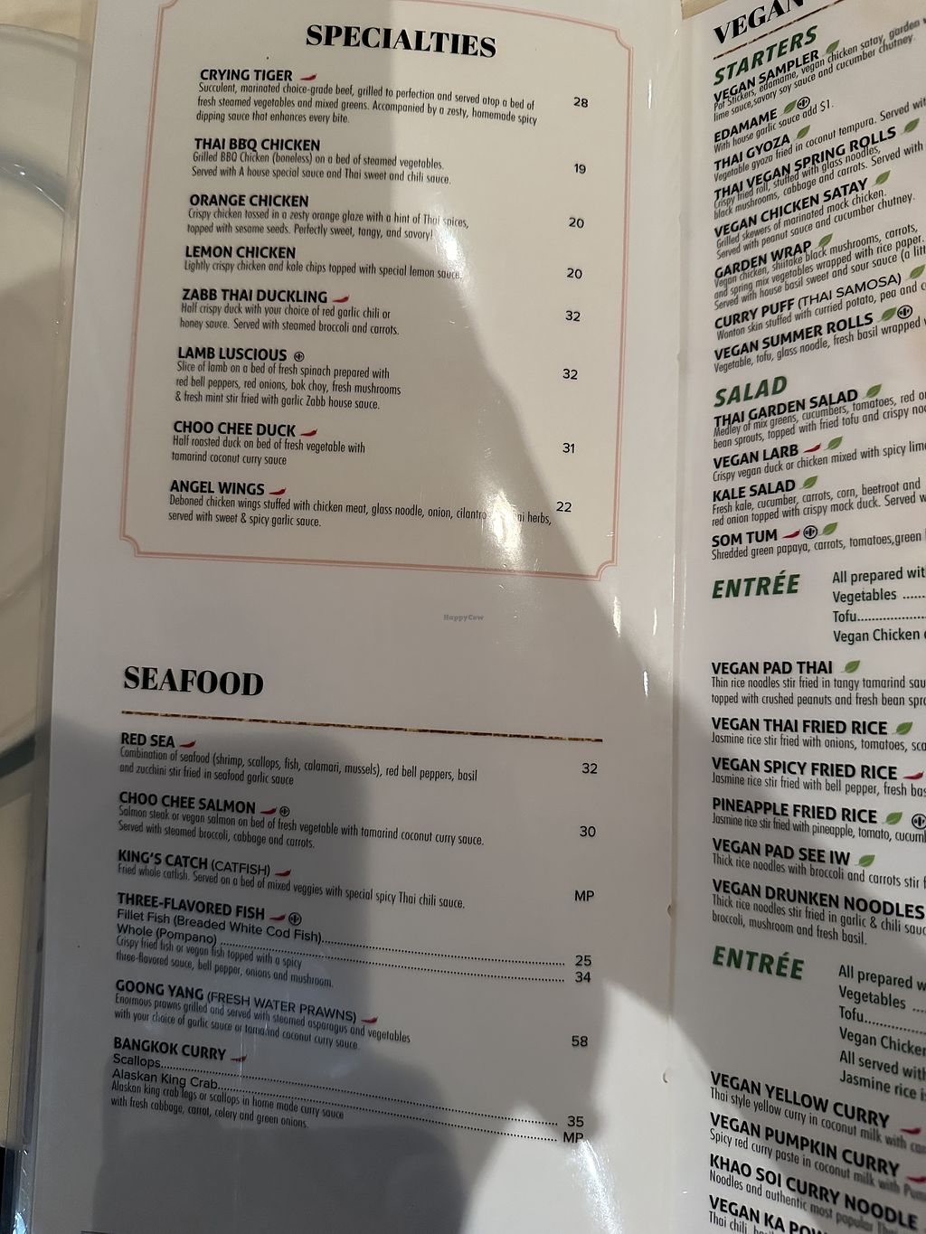 They have a nice-sized vegan section of the menu. I've had the fried tofu appetizer, which was good. I really liked the vegan duck and veggies with glass noodles dish! Very good. And to top it off, they have vegan Thai iced tea, which I believe is made with coconut milk.
