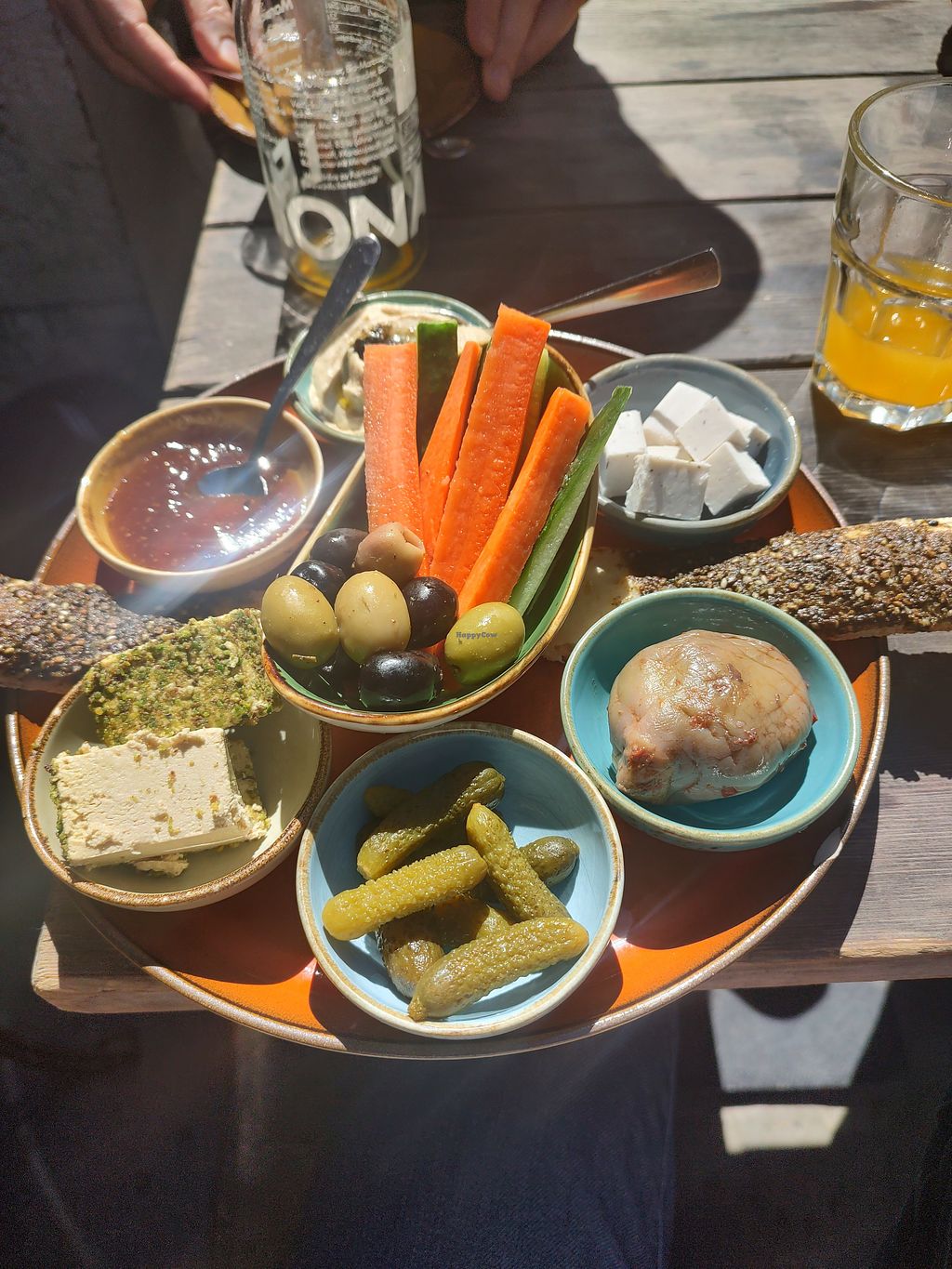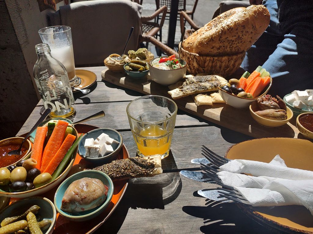 Hatten ein Frühstück für Zwei. Es gab viele verschiedene kleine Dips und Aufstriche. War alles super lecker und problemlos vegan möglich. Die eingelegten Auberginen waren der Hammer.